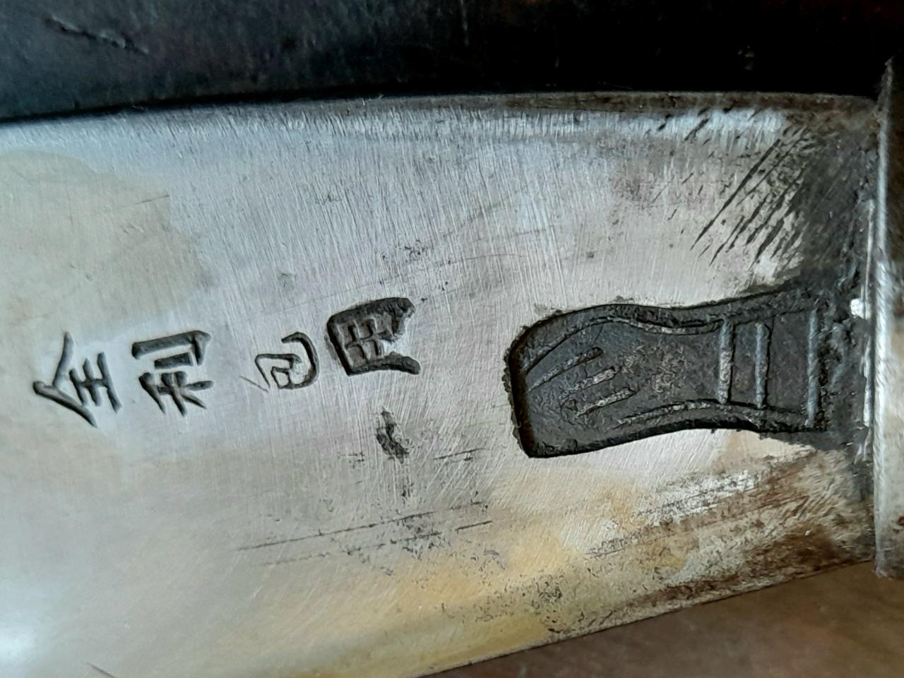 Any thoughts on the type, age and origin of this Indonesian type chopper please? Markings are strange including the pointing hand stamp. The script seems to be Chinese and Japanese using Google so I'm stumped. Steel ferrule. Lovely green horn hilt Solid very sharp blade with clipped false edge. Thanks