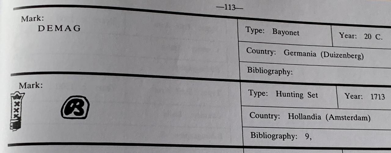 In the case of these types, Amsterdam was a major exporter of arms and armour, including items that they acted as middlemen for. The 'Sahagun' mark and Passau running wolf are generally considered to be a sign that the blade was made in Germany for onward export by the Dutch. The XXX Amsterdam control mark is often found under the hilt or overlapped by it, indicating assembly after inspection in Amsterdam, though there is some evidence of hilts also being made in Germany, such as at Koln (Cologne).