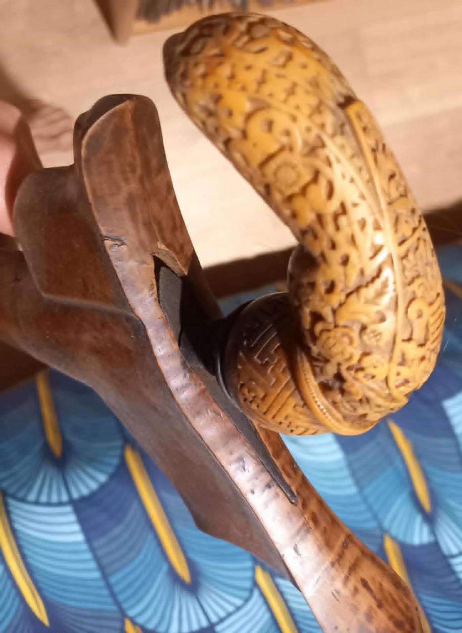 I have this Keris with a very nice ivory hilt, but I find the scabbard very unusual. I think the warangka isn't the original one because it seems to have been lengthened to fit the blade. The selut also seems more modern than the rest.