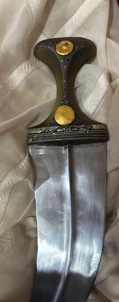 The coins on the hilt are brass imitations of silver Venetian ducats. Originals (pre-1948) are prized for their conference of special status upon the owner.
