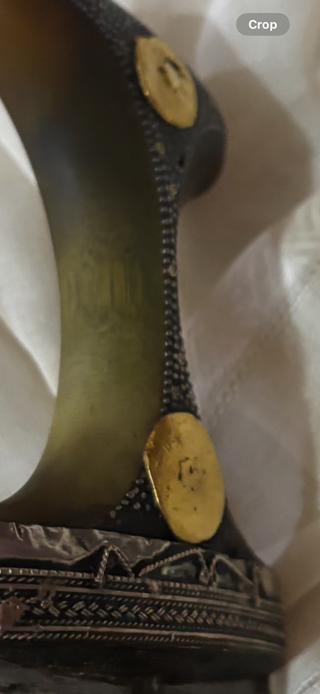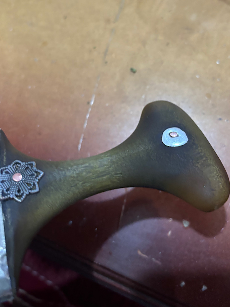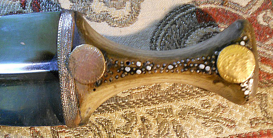 On my hilt pins are steel and the strip at the base of the hilt is silver. I do not have a firm data-driven estimate of the date, only what the seller has told me. The saifani hilt gets darker with time, but regular handling is also required. Yemeni men often rest their hands on the hilt of the jambiya so that confounds the dating.