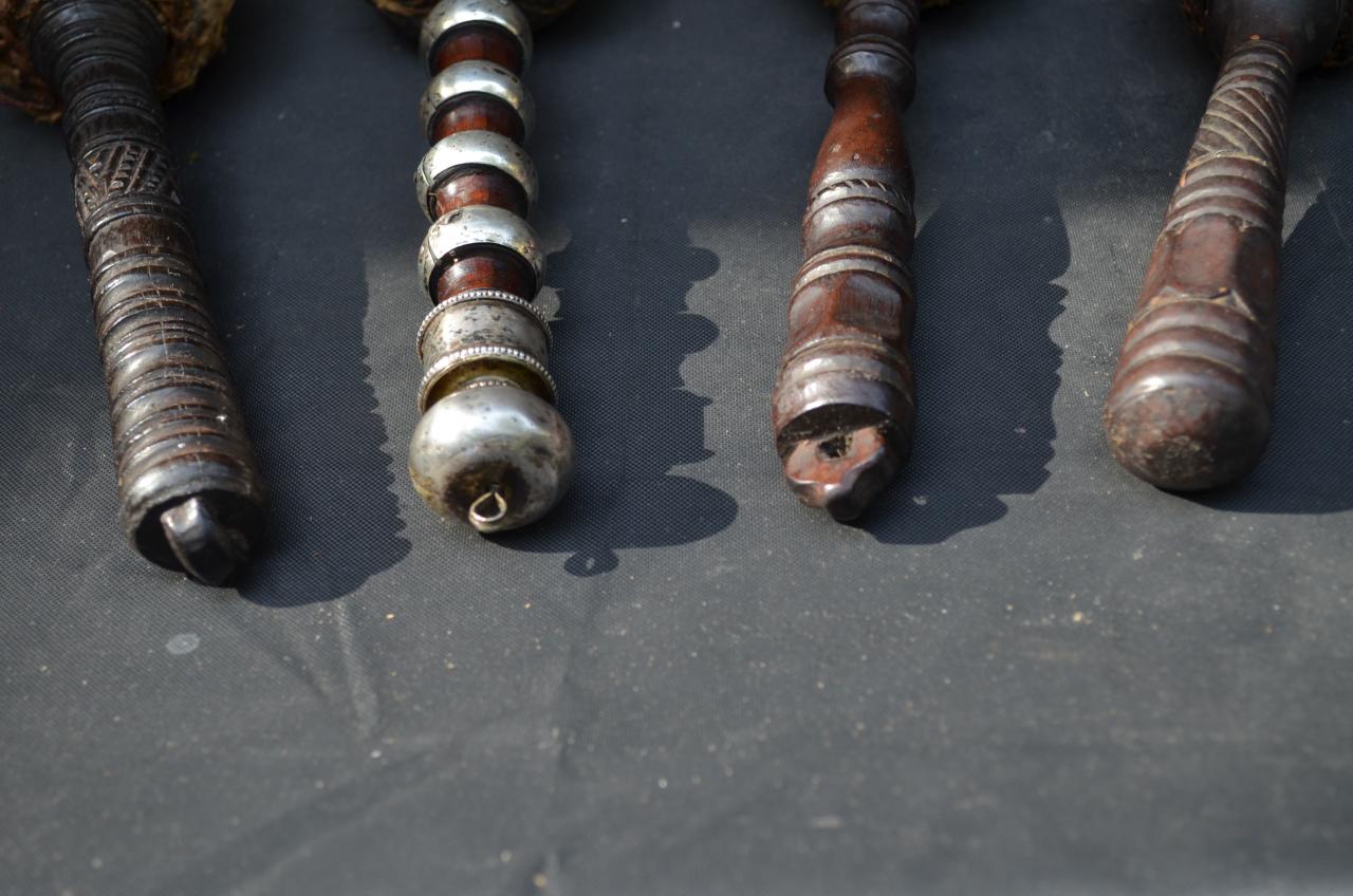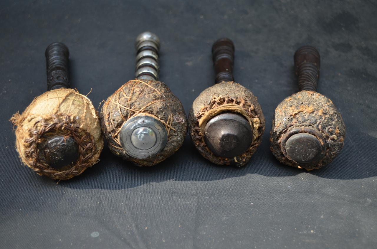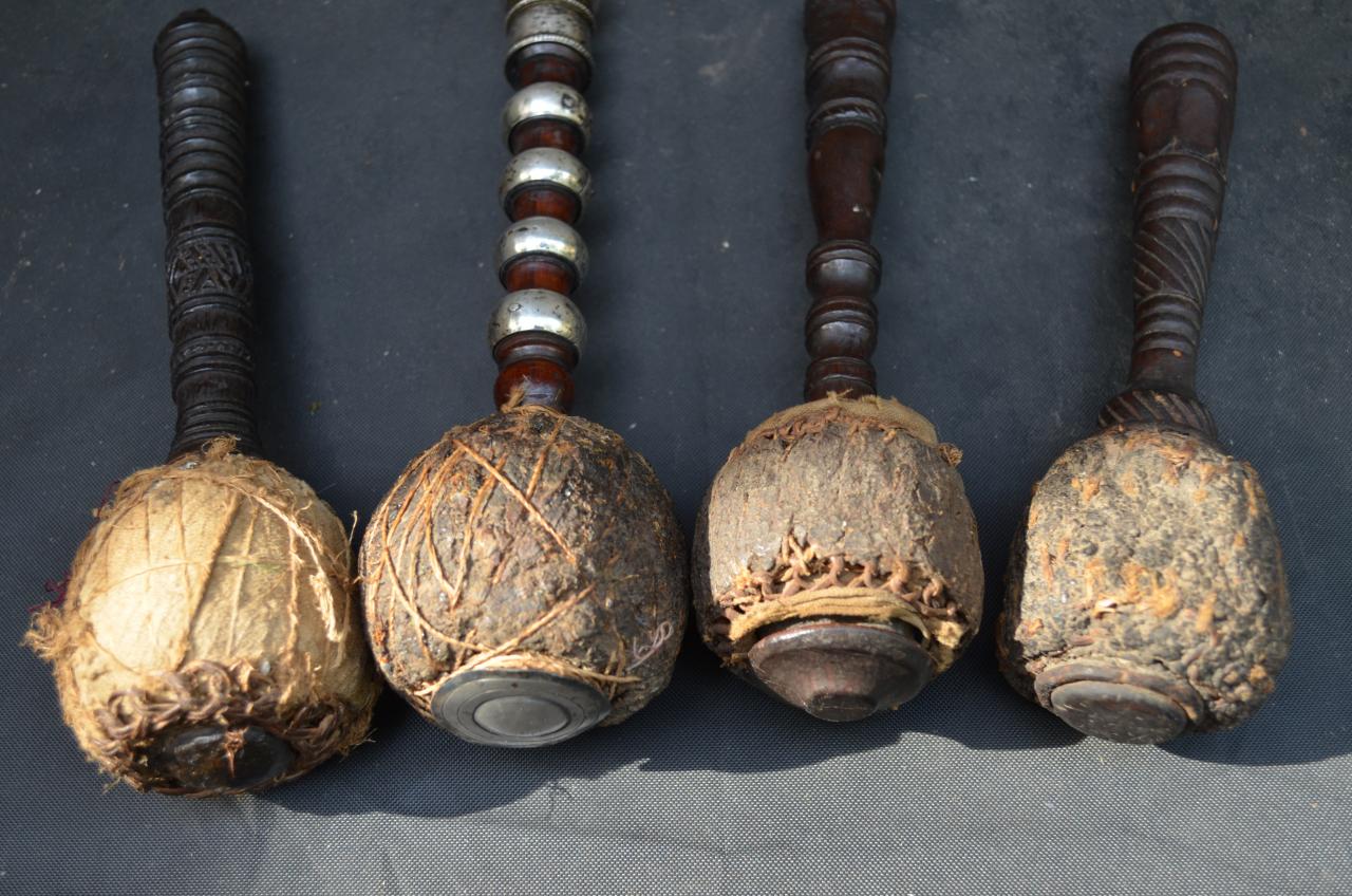I recently purchased a lot with these items in it,I'm guessing that they are some type of instrument to strike a gong, etc. They measure approx. 9" long and the heads are solid;I.m not sure if they are resin or some type of nut.