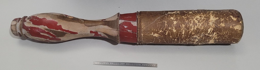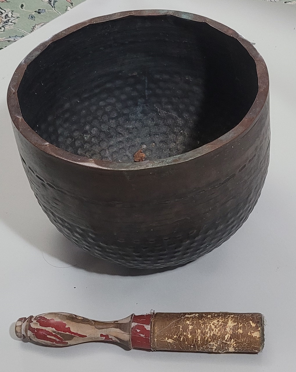 From the Brimfield Market at least a decade ago (J & J's at the time so I omit 'flea' before market). I spotted the big bowl gong and bought it and the dealer said that somewhere in his van was the mallet that went with it and for me to please return before I left for the day. I am glad I followed his advice. When I did so, he gave me the mallet and implored me to buy two late (Boxer era) Chinese sabers for $75 each which I presumed at the time were replicas, but which upon closer examination months later proved to be antiques. The ruler is 4".