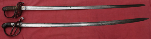 The officers heavy cavalry sword is actually the 1821 pattern with the 'honeysuckle' guard. I have a Wilkinson example dated to 1879. The 1821 pattern heavy cavalry officers sword was adopted by officers of the light cavalry in 1896 and was subsequently designated the universal cavalry officers pattern. The heavy cavalry continued to use the 1821 pattern until superseded in 1912. The 1821 is still carried today by the Honourable Corps of Gentlemen at Arms. Attached is a photograph of the Wilkinson 1821 pattern H.C. (date 1879) sword against an 1821 pattern troopers L.C. sword by Osborn. You will notice the L.C. sword (pre 1840 production) is far more substantial than the later H.C. sword. Regards, Norman. Ref., R. Dellar The British Cavalry Sword 1788-1912. Last edited by Norman McCormick; Today at 04:03 PM. |