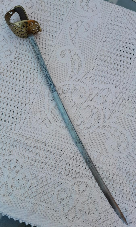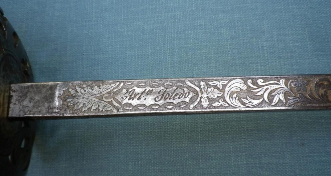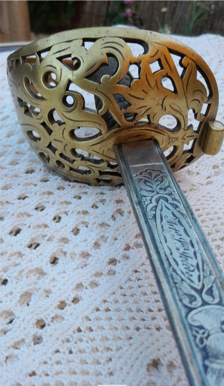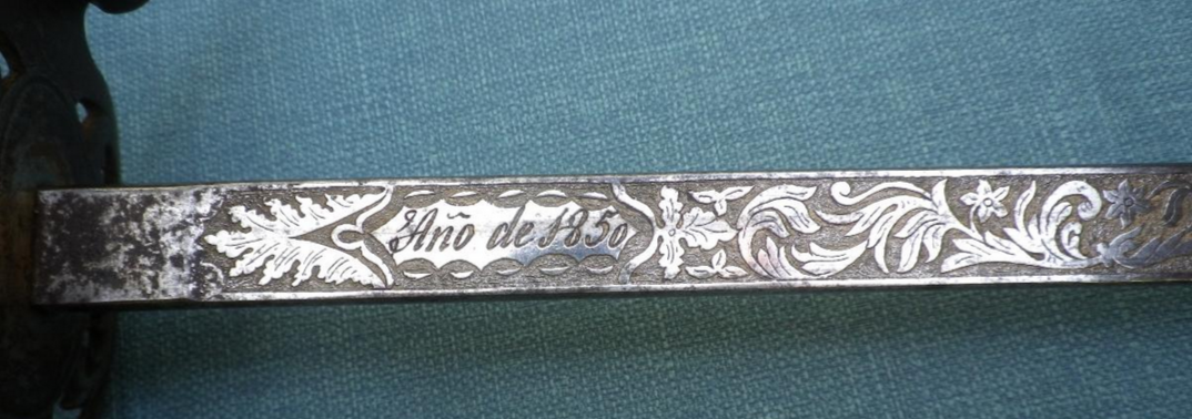 It is a British Engineer Officer hilt devoid of gilding, with a Spanish Cavalry Officer blade, dated Toledo 1850.