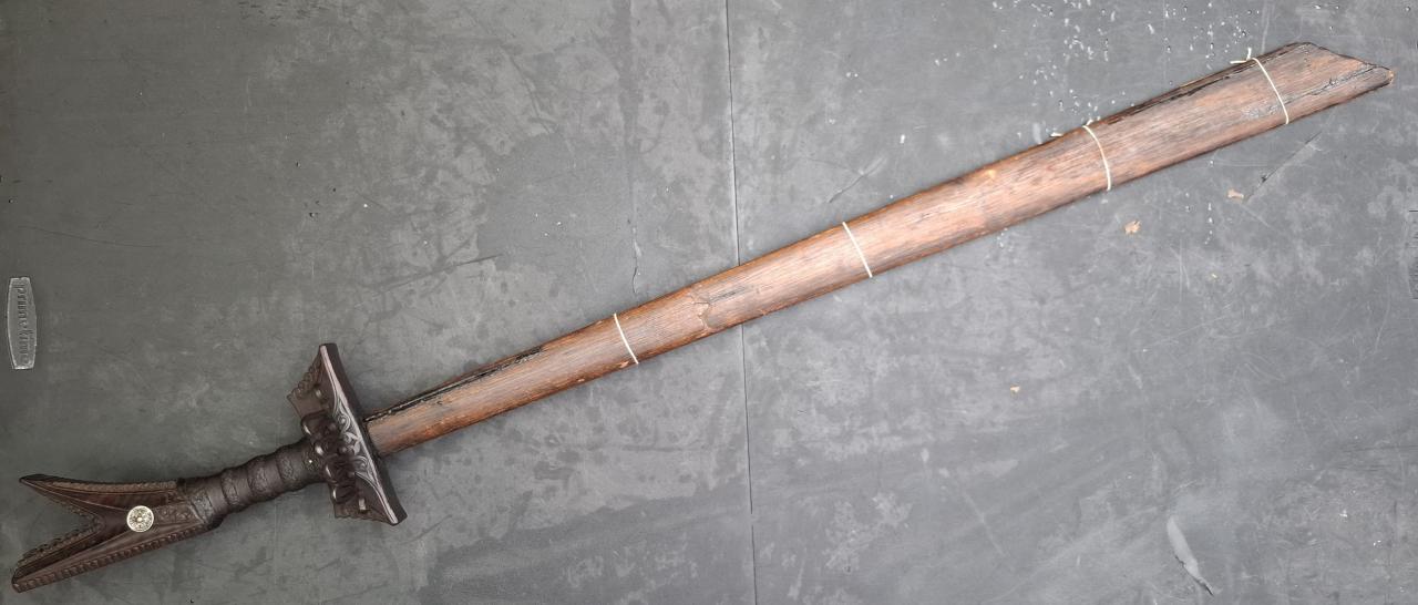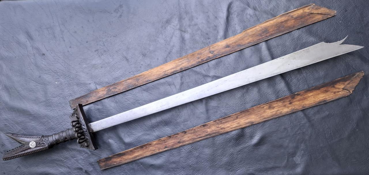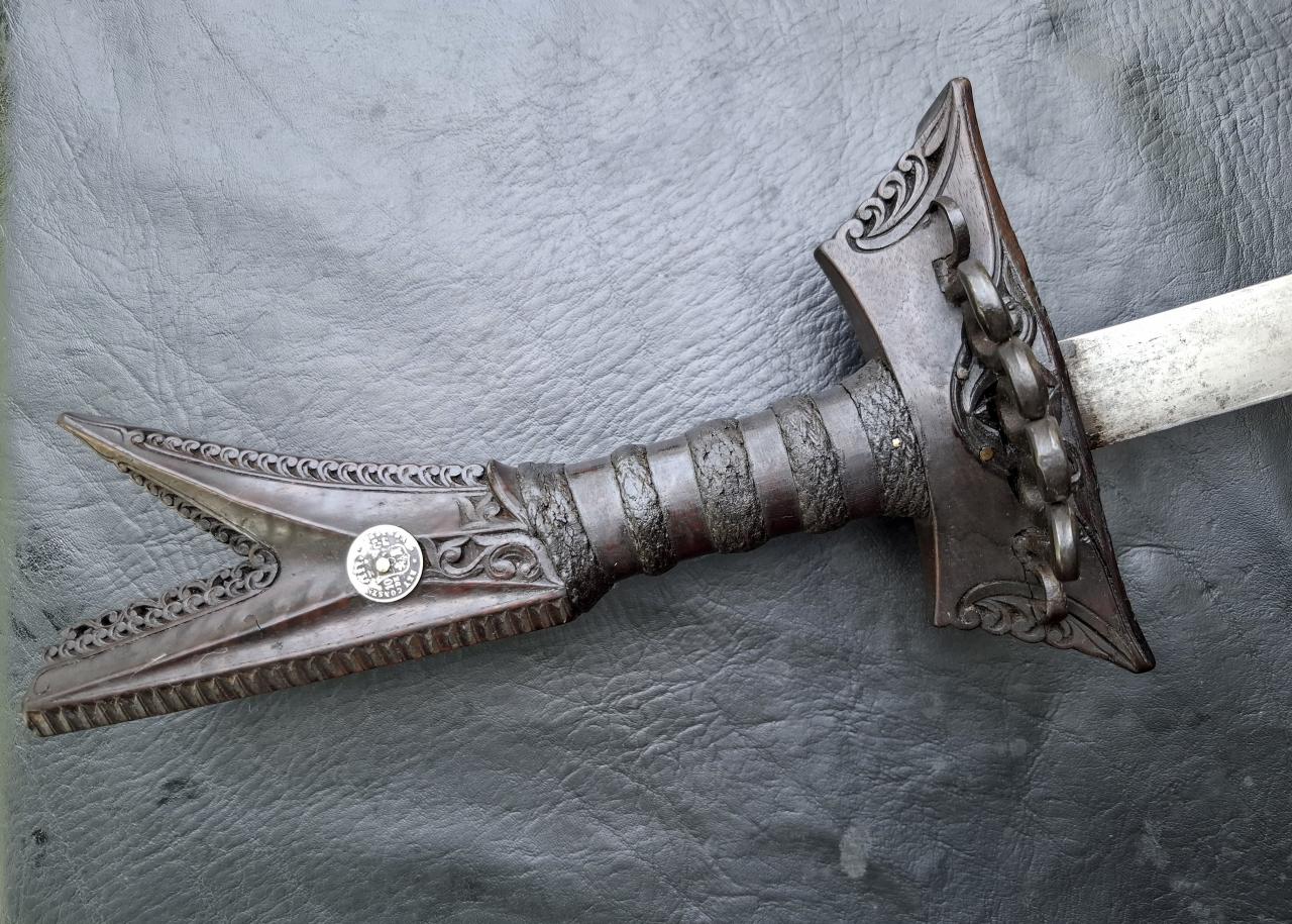 Luckily, I acquired a late 1800s kampilan with an 1882 silver coin on its pommel. This specimen has a massive 33.3in heavy blade and a mostly-complete breakaway scabbard.