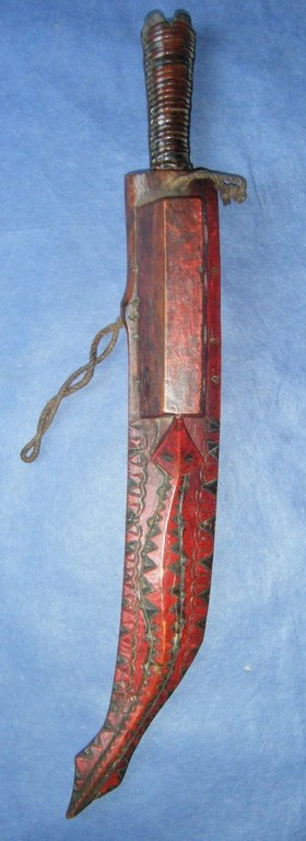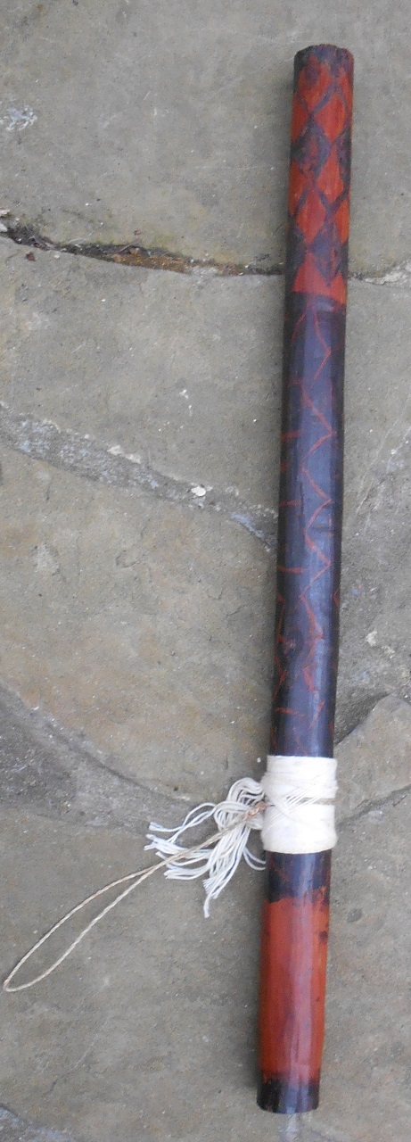 Despite its age, it is still in good condition despite some signs of it having been used. The decorations in red and black along the shaft are of typical Paiwan design, and finish in a carved snake's head at the end. It is only the second example of a Taiwanese club thqat I have seen. The pictures are from the auction site. I will post more detailed views when it arrives. Overall length = 56 cm (~22.2 in) |