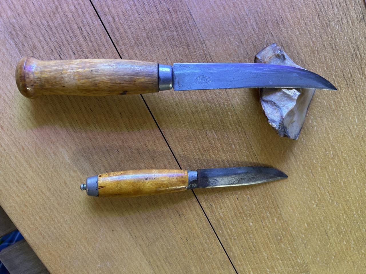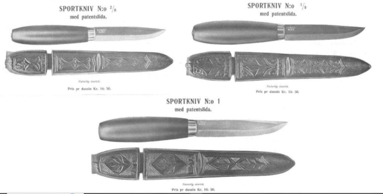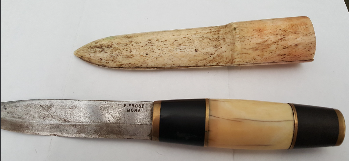 The first picture is from a 1911 catalogue. I cannot tell if this is a drawing or an actual picture. This is where I noticed that an E. Frost could be on the right side as well. The second shows an E. Frost left side stamp. The later pictures of worn knives with the simple handles are from my collection. The first of these I have carried on and off for about 20 years and may be on its third sheath with me. The new one is Kydex and may outlast me. We will see. They are all either laminated steel or a single carbon steel. The laminated ones have a higher Rockwell rating but still seem east to sharpen meaning that there are not a lot of additives to add toughness and wear resistance to the steel. I threw in a KJ Erikson for good measure in a pattern that Frost made as well. The Mora smiths seemed to overlap a good bit. |