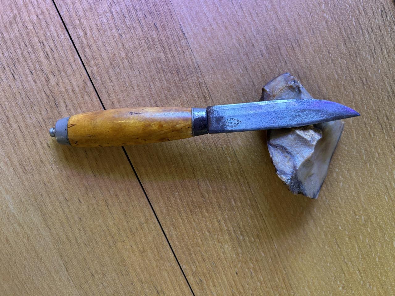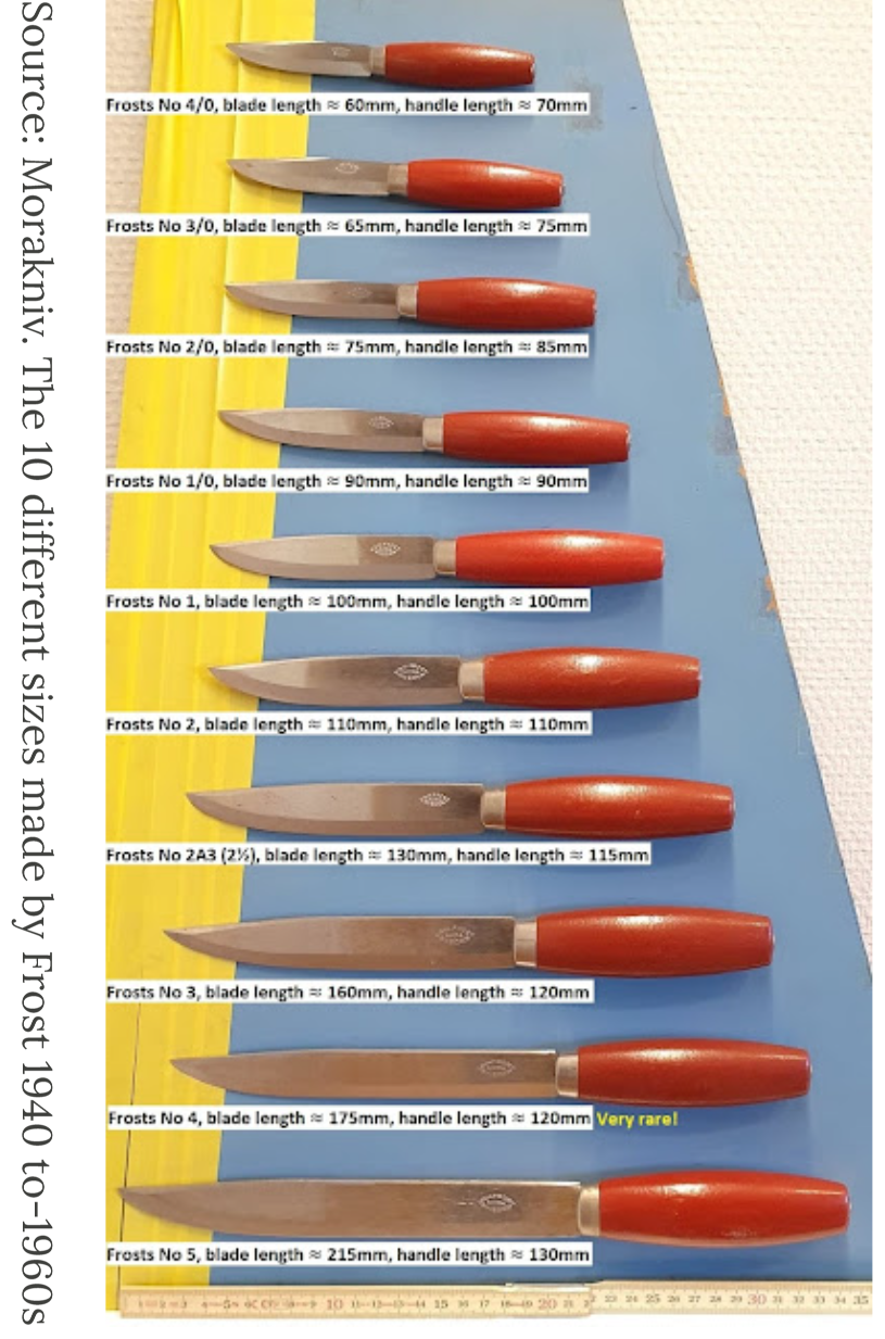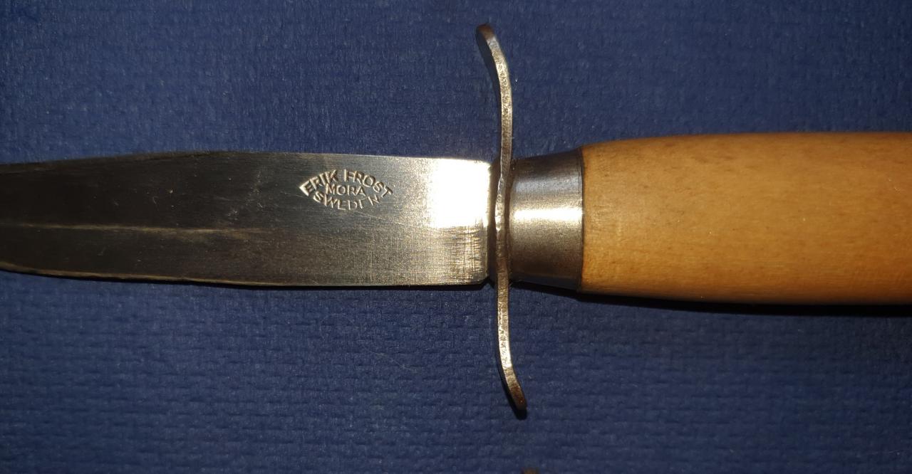 This and the recent puukko threads have opened up an interesting rabbit hole for me. It looked like a bad and worn stamp, but it made me think about all the Frost stamps I had seen and how to date them. I have not found a good timeline for the stamps yet but I have a theory that the E. Frost was first mark. Frost Erik Erikson lived from 1865-1924. The Frost brand lasted from 1891-2005 then merged with KJ Ericson to become Morakniv, The next mark is Eric Frost, and finally Frosts. The first mark I believe can be on the left or right of the blade. The Eric Frist mark is on the left side of the blade if you are holding it in normal grip. The Frosts mark is in the right side. The contemporary Morakniv mark is on the right as well. To throw wrench in this there may be Eric Frost knives made currently with the mark on the right. I found a source https://oldmora.blogspot.com/2021/11/Frost.html that I gleaned much of this information from. It appears that a pre 1930 knife should be a hand handmade in-house laminated steel, with all the metallurgical pluses and minuses these phrases imply. I.e. either much more to less durable than later blades even the laminated ones that were rolled and stamped. I would be curious to see if the pre-1930 knives possessed a distal taper. Interestingly there could be close to a billion of the various Frost knives floating around the world.