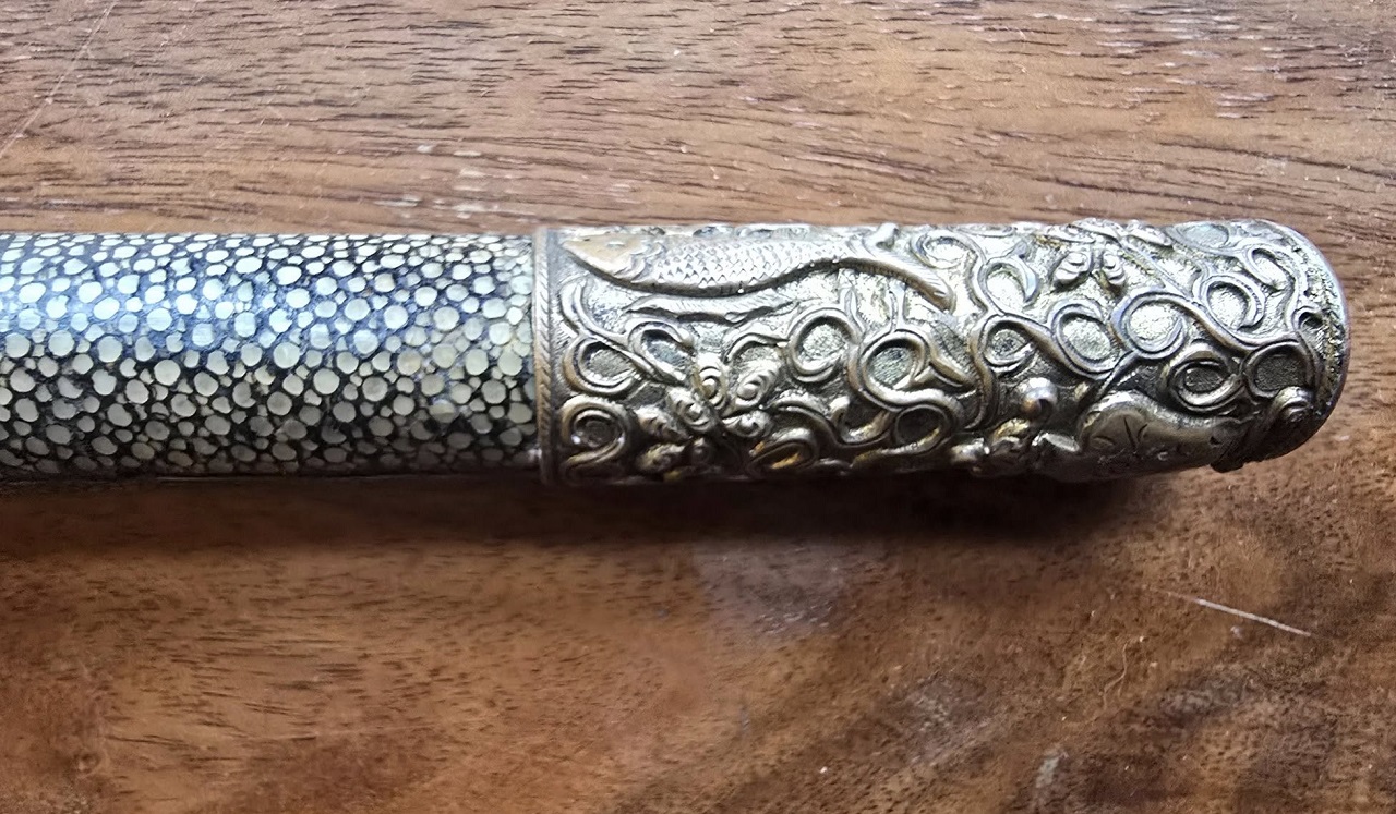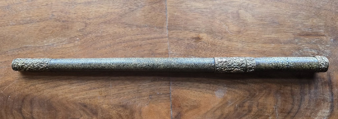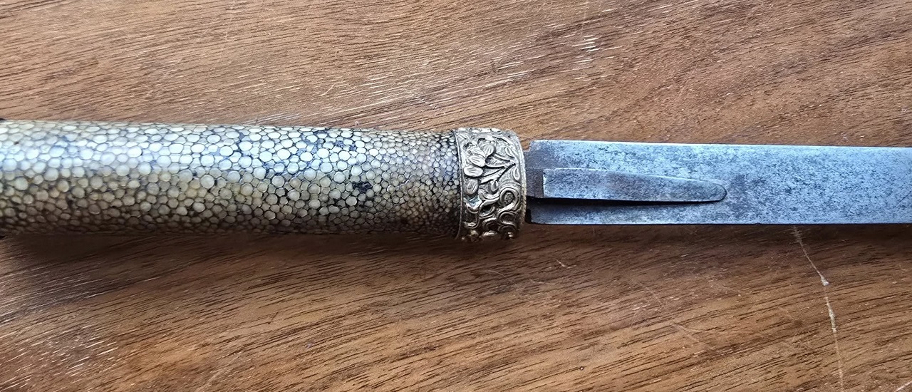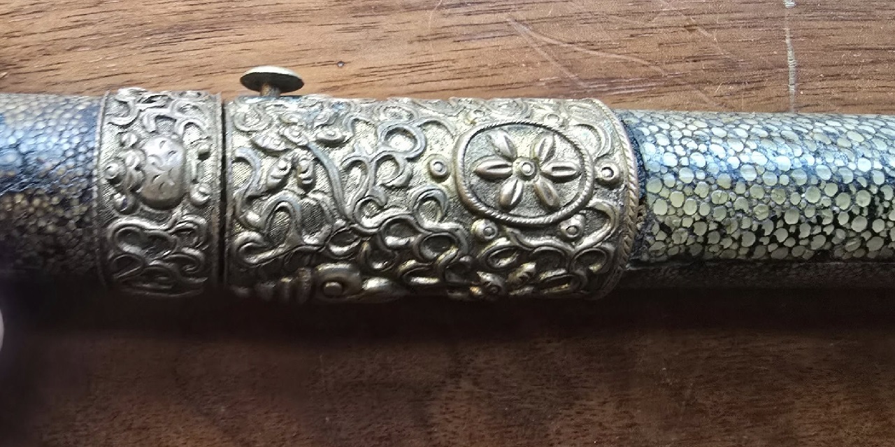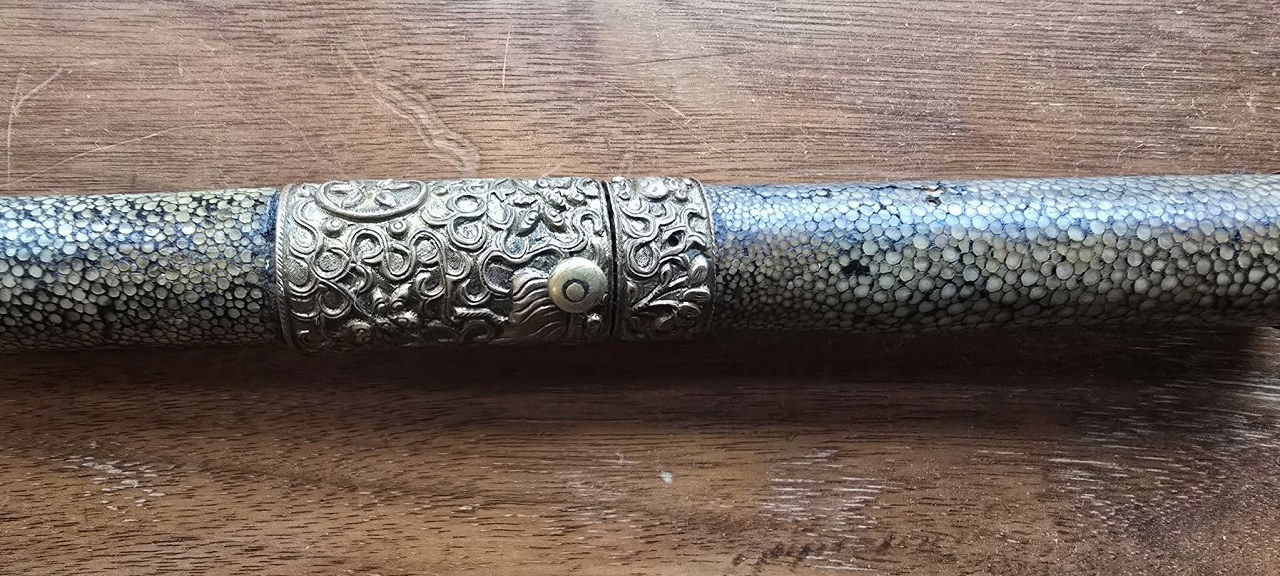 The hilt and scabbard seem to be wrapped in shagreen. And there is a kind of button lock, that releases it from the scabbard when pressed. It seems to have some age