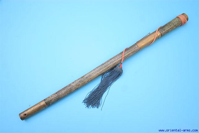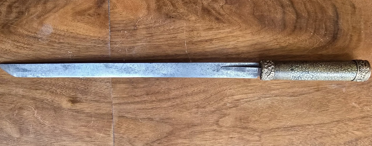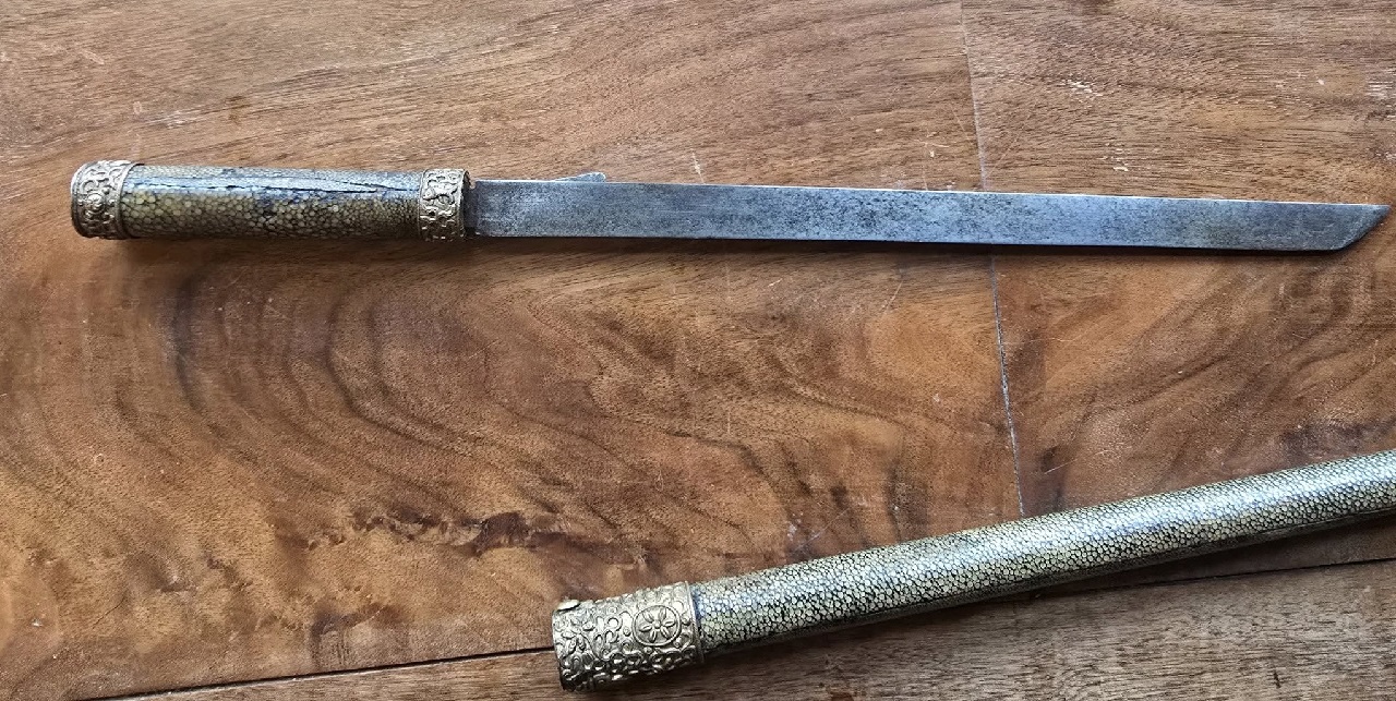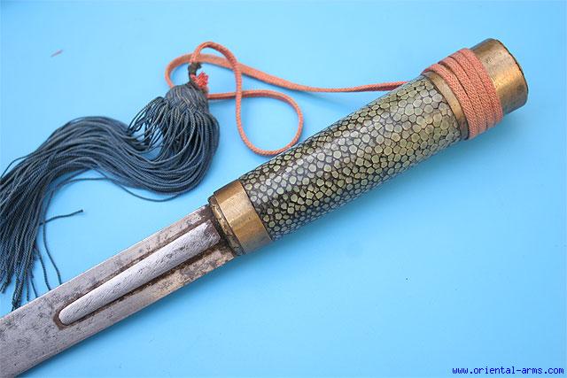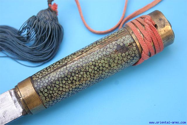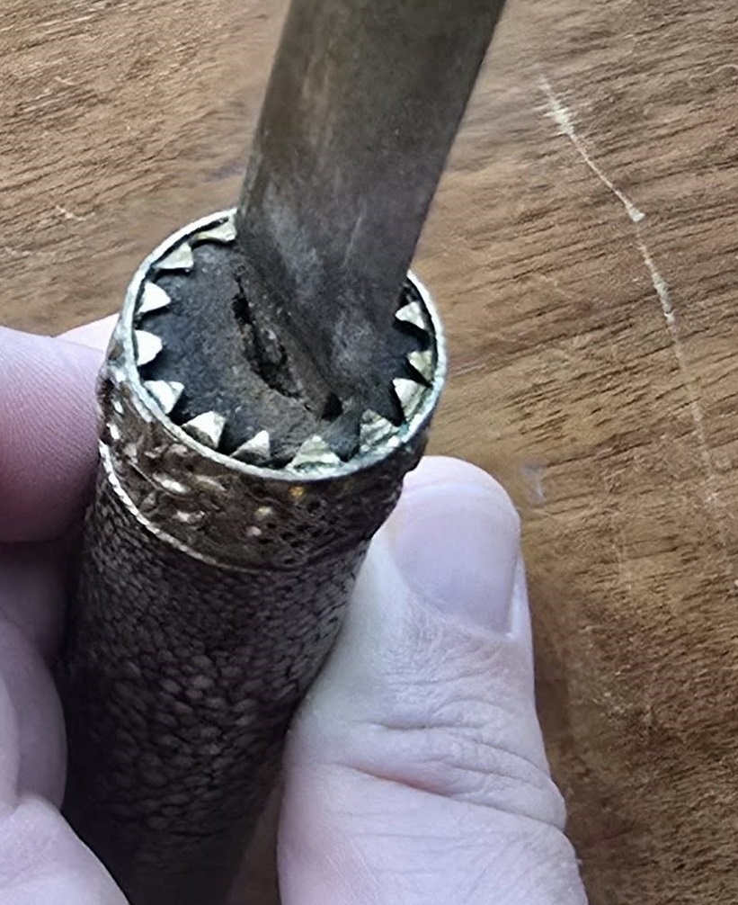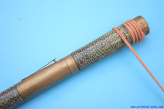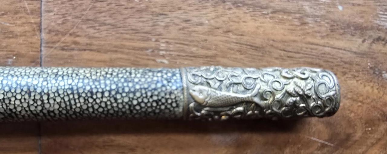 The hilt and scabbard seem to be wrapped in shagreen. And there is a kind of button lock, that releases it from the scabbard when pressed. It seems to have some age