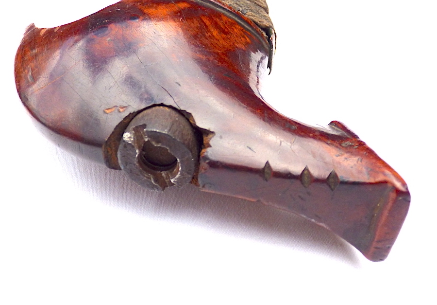 Tha attached pictures show the sword and an X-ray of the hilt. The X-ray reveals a full length tang and a threaded end to which the nut has been attached. Only about 3 cm of the original tang seems to remain. On top of it has been welded an iron rod, bent to conform to the hilt's shape, and threaded in its last few centimetres. An unusual repair for a broken tang on a kris.