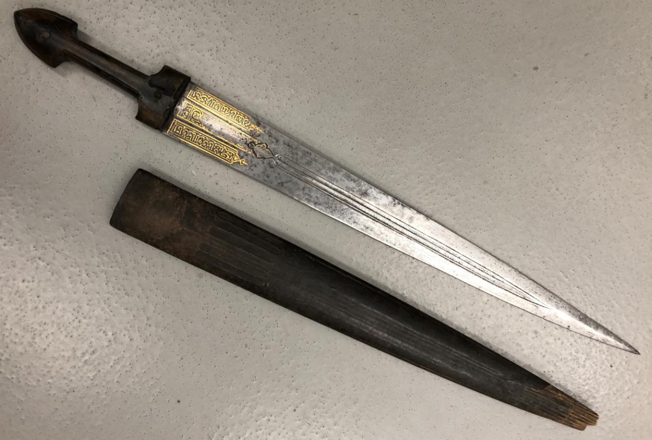 Years ago, I acquired a kindjal, the picture of which I am attaching (unfortunately, currently I only have one photo available...). I believe it is an Ottoman kindjal, very likely originating directly from the Anatolian region. I am considering a complete yet sensitive restoration, including adding the missing parts of the handle and the missing fittings on the scabbard. During my online research, I found only a few similar types of such kindjal (or qama) and came to the conclusion that the "metal band for the hanging loop" on the upper fitting (as we are used to see on all other kindjals/qamas from the Caucasus, South Caucasus, Iran, Syria, etc.) was not present on this type of dagger. Instead, the scabbards were equipped with a relatively finely made suspension loop, welded to the back or to the side of the upper fitting. For complete info, on the back of the scabbard, there is a nicely preserved spiral stitching with brass wire, which is typical, for example, of Ottoman sabers´ scabbards from the 19th century. Also, as you can see, the surface of the scabbard clearly shows the relief of the missing fittings. The handle is made from a single piece of horn, and the tang extending from the blade is firmly embedded in it. The tang does not run all the way through the handle to its end, yet it holds completely firmly (I wonder what technique they used back then to achieve such strength…). The missing rivets (see the holes left behind) therefore had only a decorative function. Based on similar types I have seen, these decorative “rivets” were shaped like flowers and often made of gilded silver, adorned with red grooved coral worked into teardrop shapes. For possible future restoration, I would appreciate photos of scabbards of this kindjal/qama type, and possibly also photos of the decorative rivets on the handle, although I have already seen a few handles. However, preserved scabbards are very rare in this case. I would also be grateful for information on whether the inscription on the blade is in so-called Osmanlı or pure Arabic, and for its translation. In my opinion, the date mentioned corresponds to the year 1870. Best, Martin |