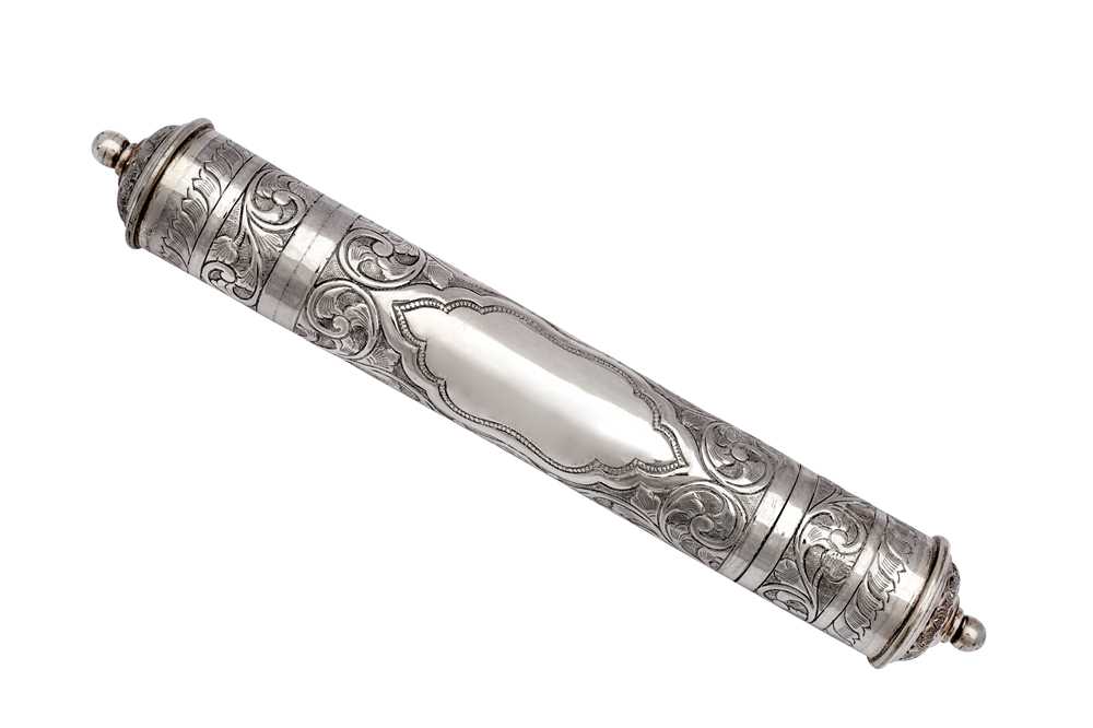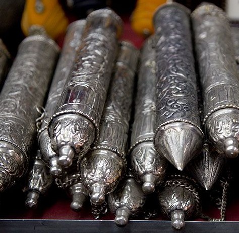 The hilt appears to be a Yemeni silver scroll holder that has been repurposed as a sword hilt.