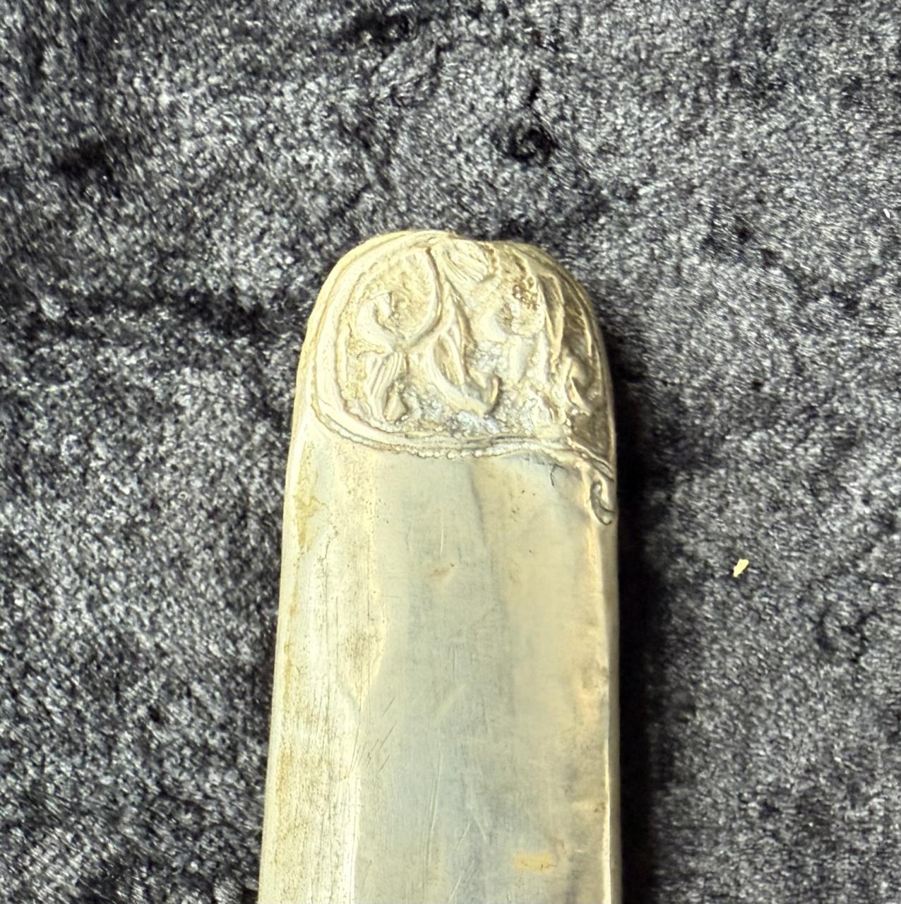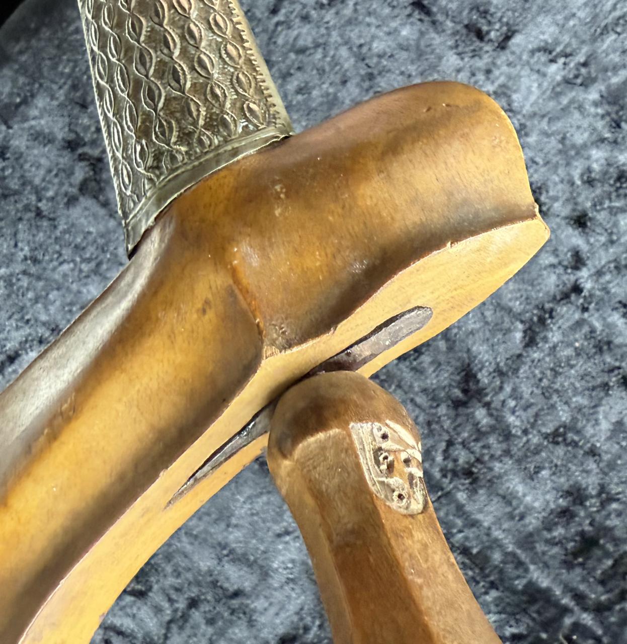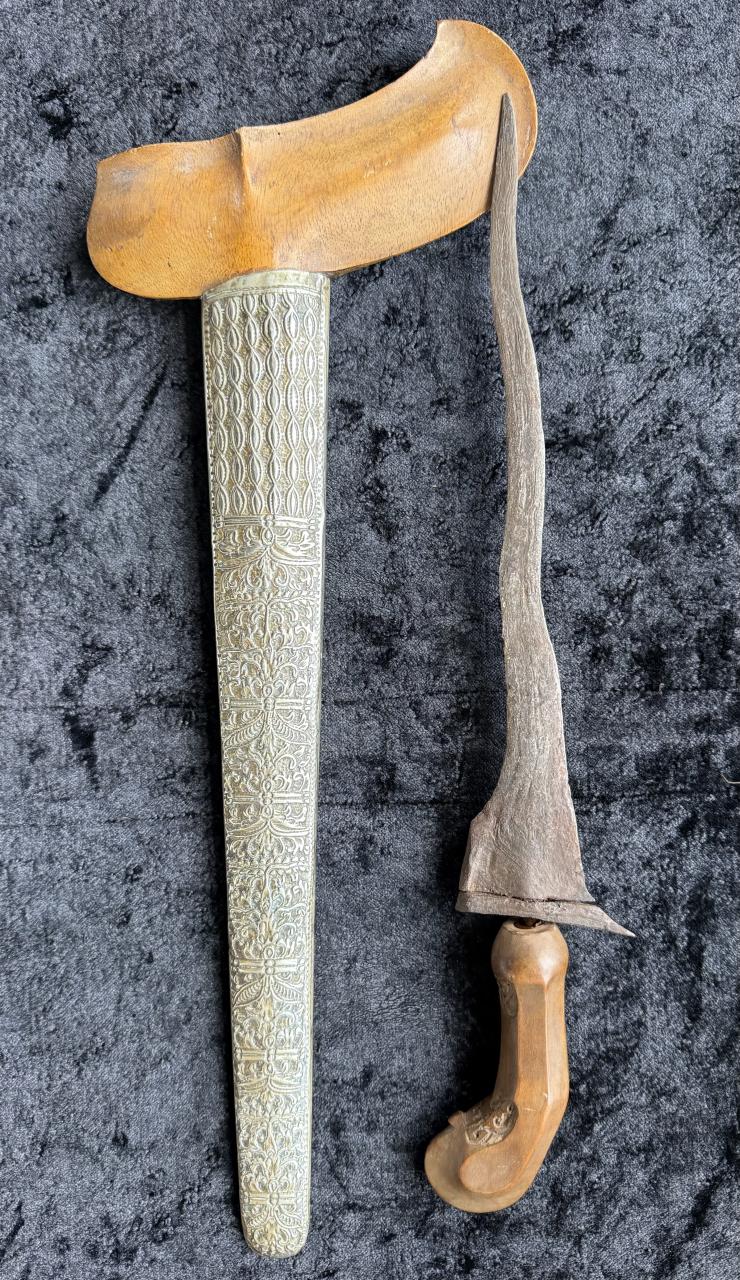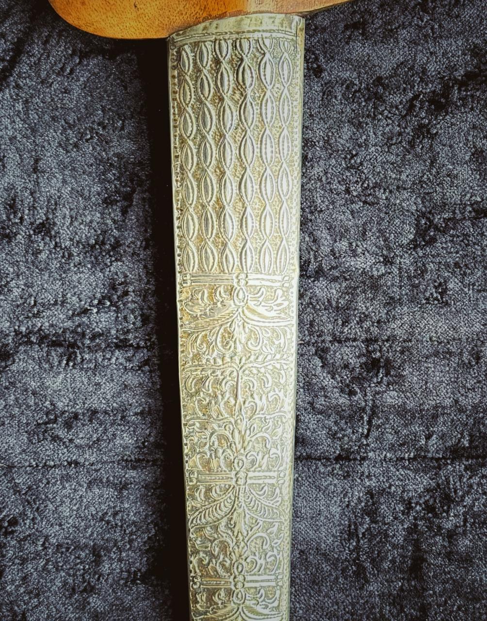 Alan is unable to put a name on this pendok motif, overall it looks like a Banyumas pendok, but it is not really out of place matched to this wrongko. It might be silver, might be mamas, no way of knowing short of a test, but it doesn’t really matter, there is no real difference in quality or value between the two materials at this end of the scale, it will be quite light in weight. Light polish with 0000 steel wool, or maybe just a silver cloth.