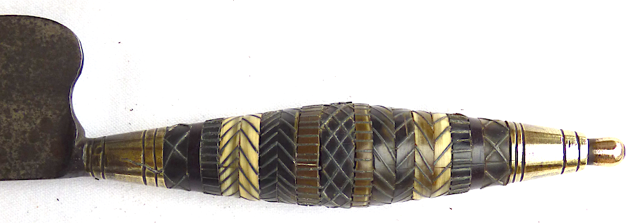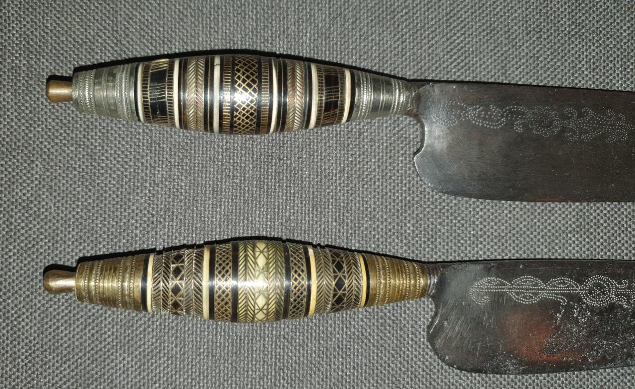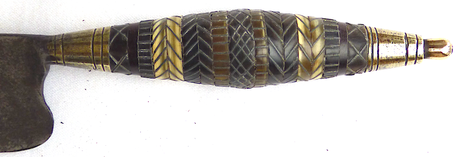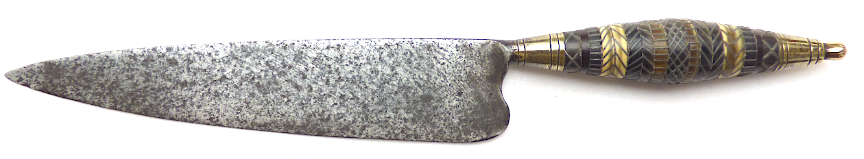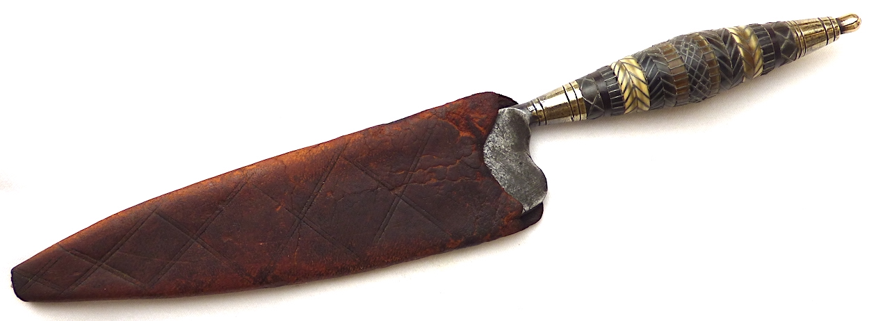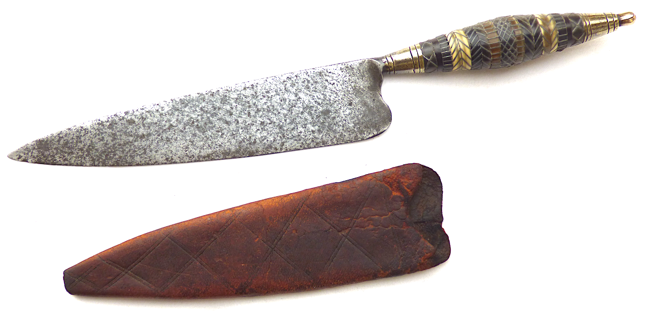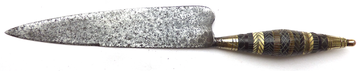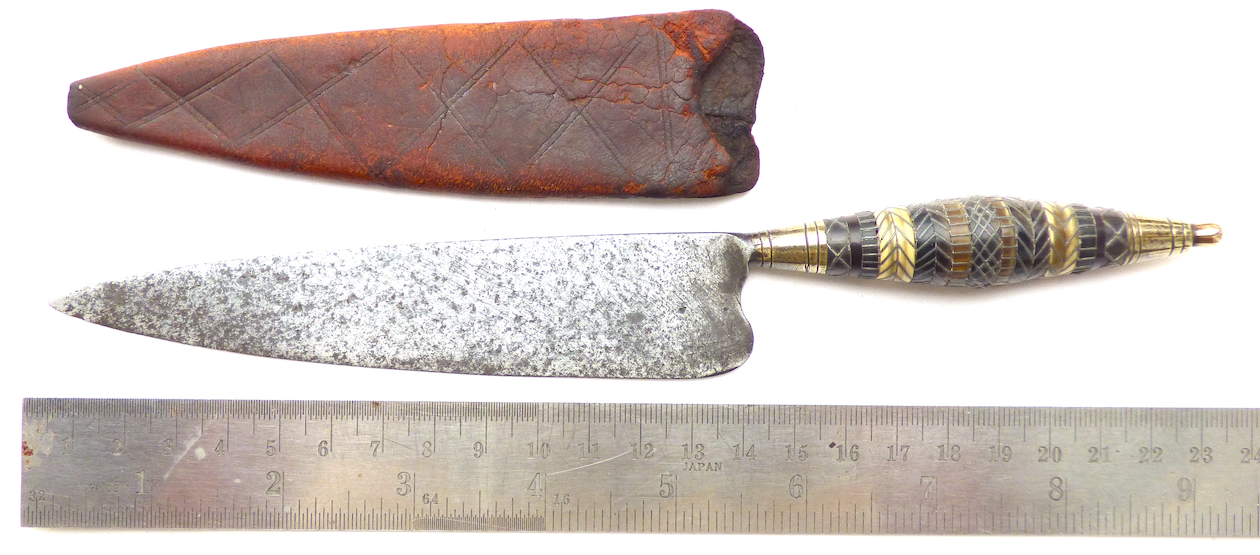 Knife 1. An example similar in size to the one I have shown in the original post of this thread. A single edge blade 5.5 inches long, dot punched decoration on the one side. Hilt composed of alternating discs of horn bone and brass. Total length 9 inches. Very good condition. No scabbard. Knife 2. A single edge blade 6.5 inches long and 1.5 inches wide, dot punched decoration on the one side. Hilt composed of alternating discs of horn bone and brass. Original leather scabbard. Total length 10.5 inches. Very good condition. Knife 3. A single edge blade 7 inches long, dot punched decoration on the one side. Hilt composed of alternating discs of horn bone white metal and brass. Total length 10 inches. Very good condition. No scabbard. Last edited by Ian; 14th December 2025 at 11:33 AM. |
