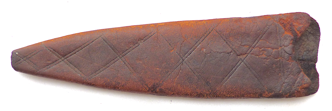 Knife 4. A big blade 10 inches long and 1.5 inches wide, dot punched Eno (?) 16 de 67 (January 16 1867) on one side and punched dot decoration on the other side. Hilt composed of alternating discs of horn and brass. Total length 15 inches. Very good condition. Knife 5. A single edge blade 5.5 inches long, dot punched decoration on the one side. Hilt composed of alternating discs of horn bone and brass. Total length 9 inches. Very good condition. No scabbard. Knife 6. A single edge blade 6 1/2 inches long and 1 ½ inches wide, dot punched decoration on the one side. Hilt composed of alternating discs of horn bone and brass. Original leather scabbard. Total length 10 1/2 inches. Very good condition. Last edited by Ian; 14th December 2025 at 12:12 PM. |