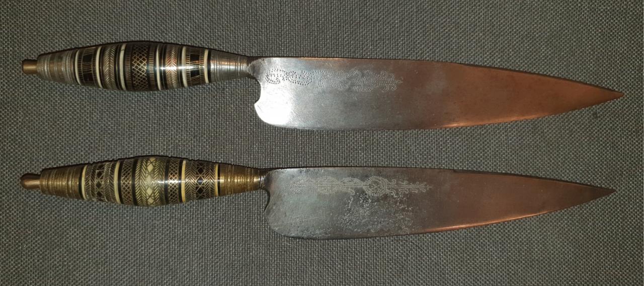 Knife 7. A single edge blade 6.5 inches long and 1.5 inches wide, dot punched decoration on the one side. Hilt composed of alternating discs of horn bone and brass. Original leather scabbard. Total length 11 inches. Very good condition. Knife 8. Single edge blades 5.5 and 4 inches long with dot punched decoration on the one side. Hilt composed of alternating discs of horn bone and brass. Original leather scabbards. Total length 9.5 and 6.5 inches. Very good condition. The seam of the small knife scabbard is open. Knife 9. A single edge blade 7 inches long and 1.5 inches wide, dot punched decoration on the one side. Hilt composed of alternating discs of horn and brass. Original tooled leather scabbard. Total length 11.5 inches. Good condition Old grinding and re-sharpening signs on the blade. Last edited by Ian; 14th December 2025 at 12:28 PM. |