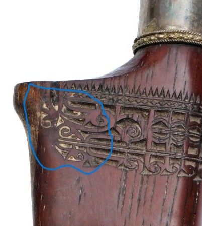 I personally would clean the silver to shiny but Batak silver is good silver which soon gets dark again. There is also a little bit of suassa involved, I've marked it on the attached picture. And yes, I would clean the blades but these blades don't show any lamination. Karo Batak kalasans are not extremely rare weapons but they are somewhat rare in the quality you got in your two examples, I like them! ![]() And the hilts are of the sukul djering form. Regards, Detlef Last edited by Sajen; Today at 06:16 PM. Reason: Add information |