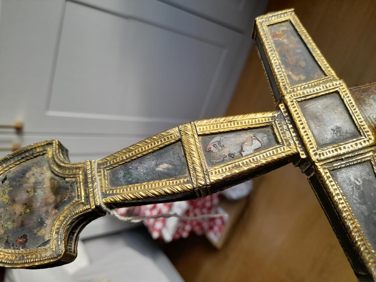 Looking for info on age and origin of this please. Gold mounts with missing details on hilt angels. Lenticular cross section springy steel sharp blade. Velvet scabbard. Thanks |