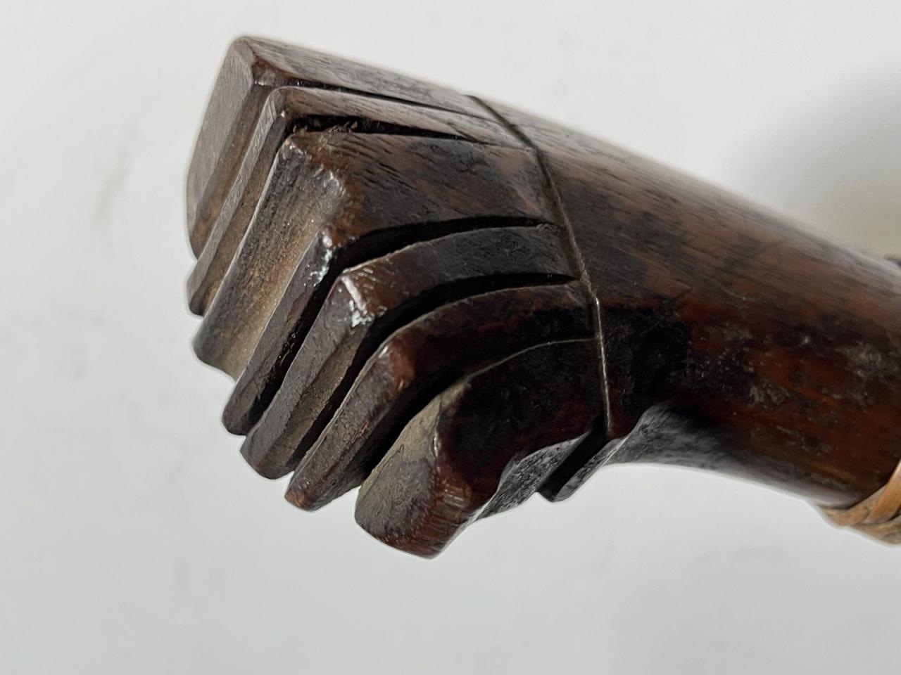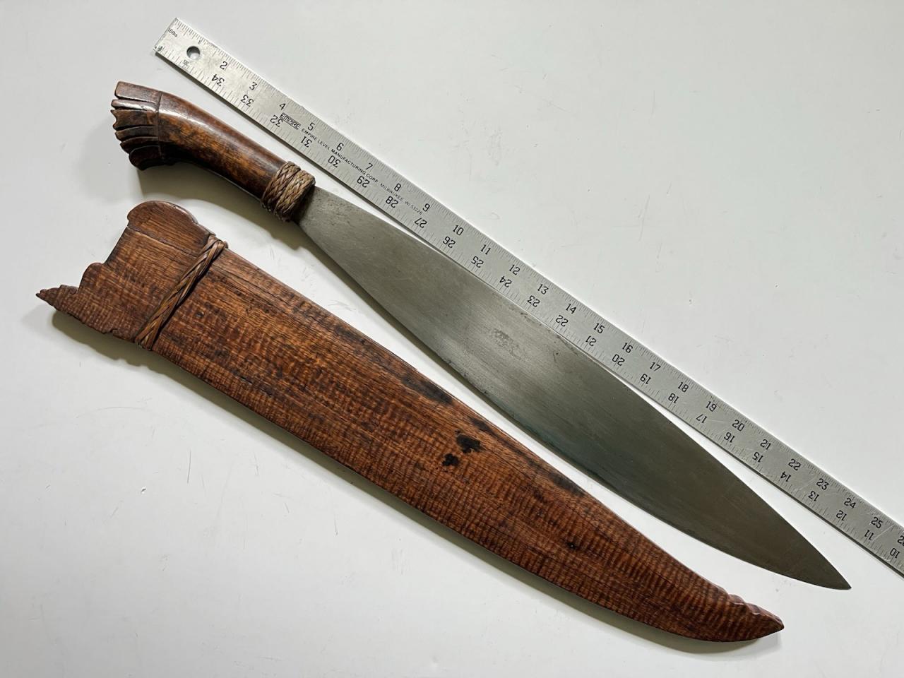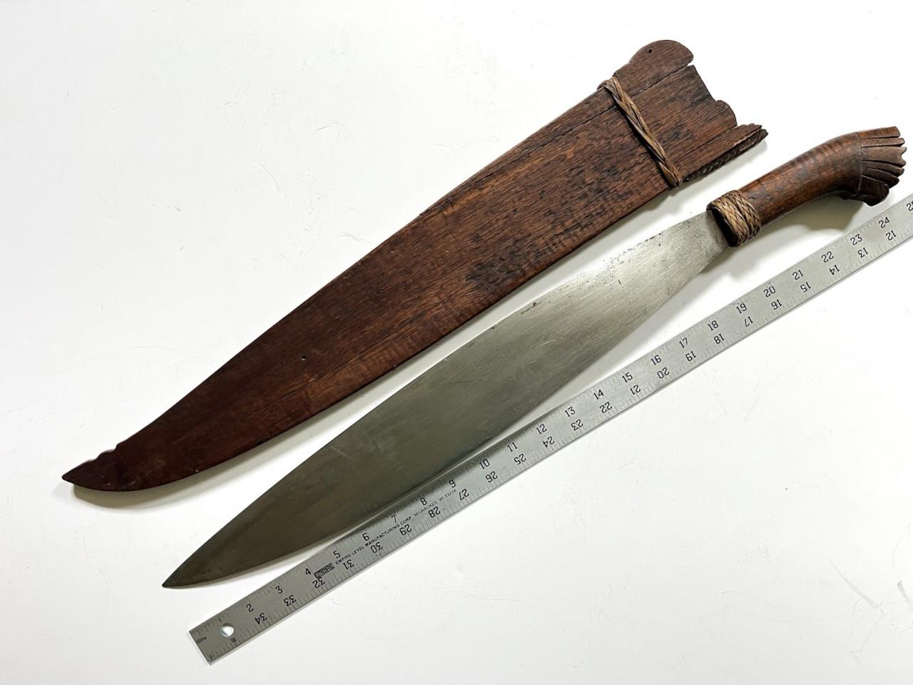 It is a Moro barung of relatively recent manufacture judging from its appearance--perhaps late 20th C. The pommel is atypical in form, comprising a (roughly) horse hoof-shaped hilt with a series of vertical, deep cuts. The usual metal punto has been replaced by two woven rattan bands. The scabbard comprises two pieces of flat wood tied together with rattan near the throat. The rest of the scabbard may be glued. There is no carving at the scabbard throat that might assist in identifying this barung with a particular Moro group. Overall, the hilt and scabbard are made of inexpensive materials, although the blade seems of reasonable finish. My initial thoughts were that this barung came from Palawan or Zamboanga. However, on talking with a fellow forumite, Xasterix, it seems more likely that it comes from the Sama people who are from the Sulu archipelago. It's an odd one. Your thoughts and comments are most welcome. |