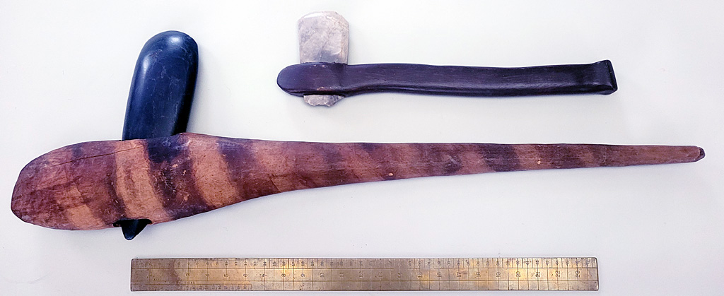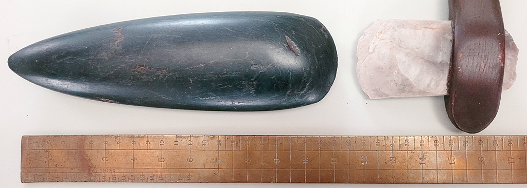 The larger axehead weighs 1.626 kg and measures 28.5 by 8.7 by 3.9 cm. The ruler is two feet in length.