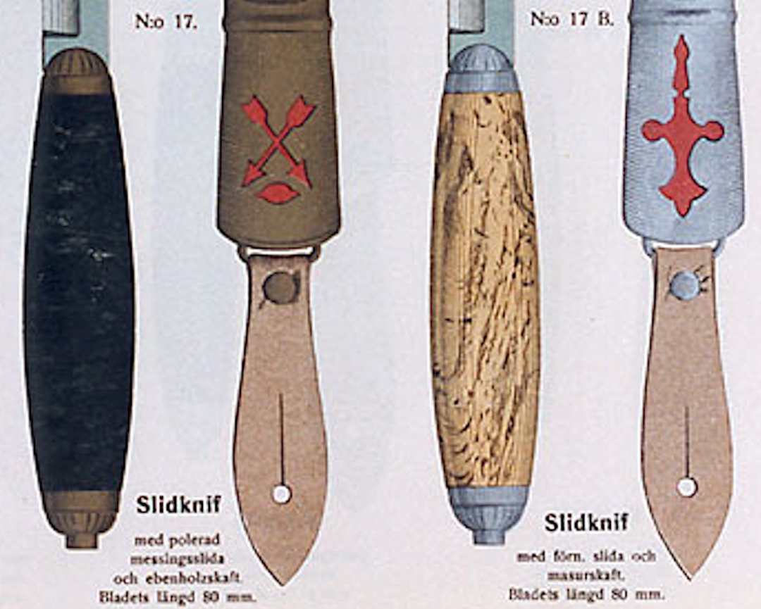 Refngard, many thanks for finding these! I like the Art Nouveau cover page of the catalog. Interestingly for me, the only difference between the dolk and the slidkniv is the presence of the crossguard on the dolk and has nothing to do with the blade architecture. "Slid" means slide in this context?