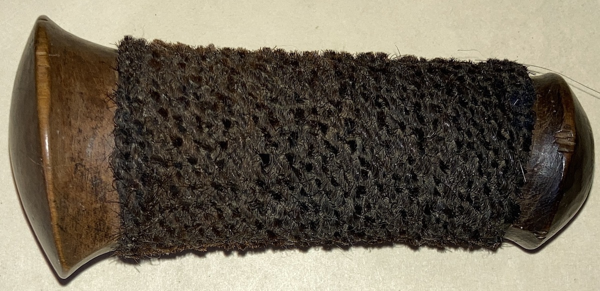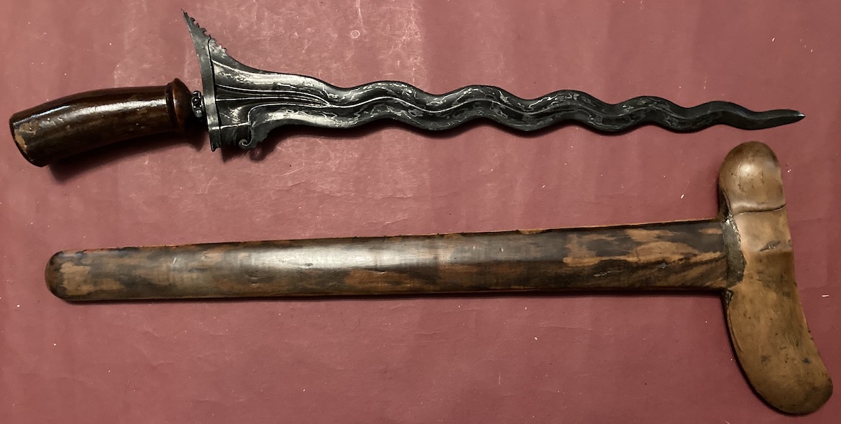 So, if I understand you correctly, the proper spelling would be cenangan but, since that is a fairly recent coined catchall term for related forms of simple hilts, both of my examples should more properly be called tapukan? With this post I have provided an example complete with hair covering. The wood of this hilt is one piece but the wood of the second kris I showed is in two pieces. As for that second kris, you may very well be correct about the “crosspiece and the long part” not being original to each other. The figure in the wood of the gandar and that of the wranka don’t match. Also, that large brown patch where the two parts of the sheath join appears to be some kind of wood putty. There is also evidence of extensive repair to the same area on the back side of the keris.