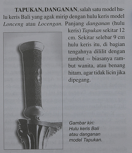 Let's take a look on non-figural Balinese Keris hilts in that book. About the form with gold wire braiding between Selut with stones and an end piece with Liking Paku figurine, he writes - it is called Loceng (which is Loncengan), in North Bali called Grantim (Gerantiman). If such hilt (in North Bali) has a plain Selut (apparently still with braiding), it is called Loceng (Loncengan). If such hilt, with Selut and Liking Paku finial, appears with plain wooden body, without braiding, it is called Telaga Ngembeng. After a couple of paragraphs he calls exactly the same hilt form Tapuk (Tapukan).