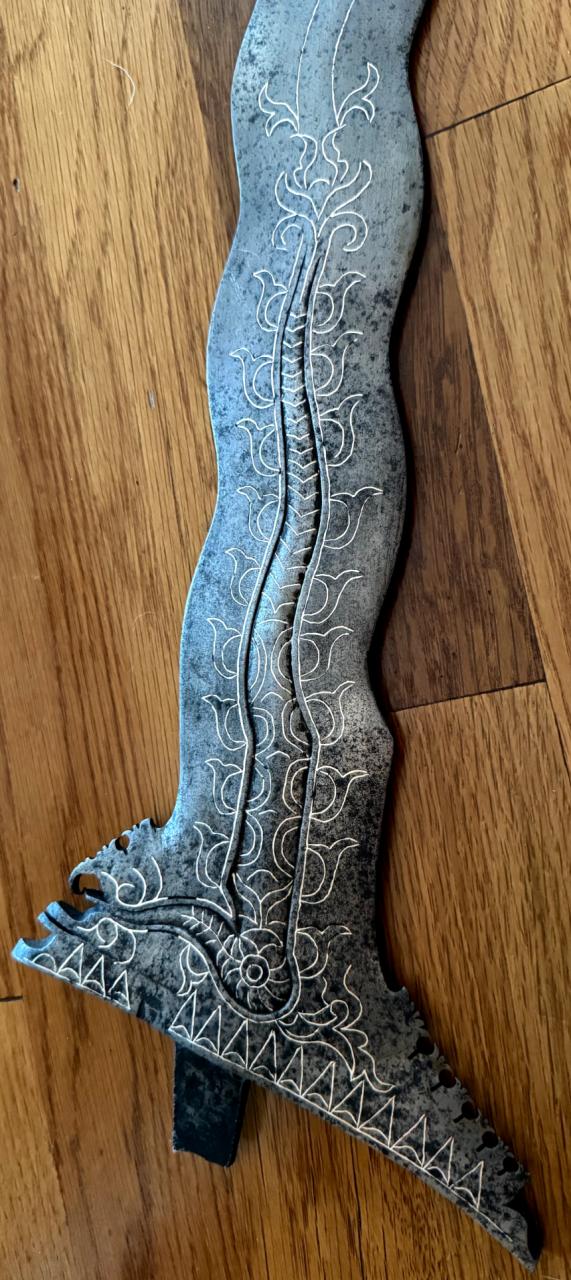 Thank you for the link and info. It led me, at last, to the specs (below) for the kris that Gustav cited in post #21 - yours, I take it. Mine is a little shorter (57 cm & 11 waves) but the overall construction and inlay logic seem very similar. What especially caught my attention: both seem unusually (?) stout at 1.5 and 1.6 cm. Curious about your opinion on the comparison and any thoughts you're willing to share. https://vikingsword.com/vb/showpost....40&postcount=7 Name: Ki Pakpak Cat: BadjoNaga Type: SaptaPratala Wave: 13 Blade: 60 cm. 1.5 cm. thick Age: c.1900 Origin: Mindanaoe Comment: Silver inlay along length of blade on both sides. One more photo, in case it's helful: |
