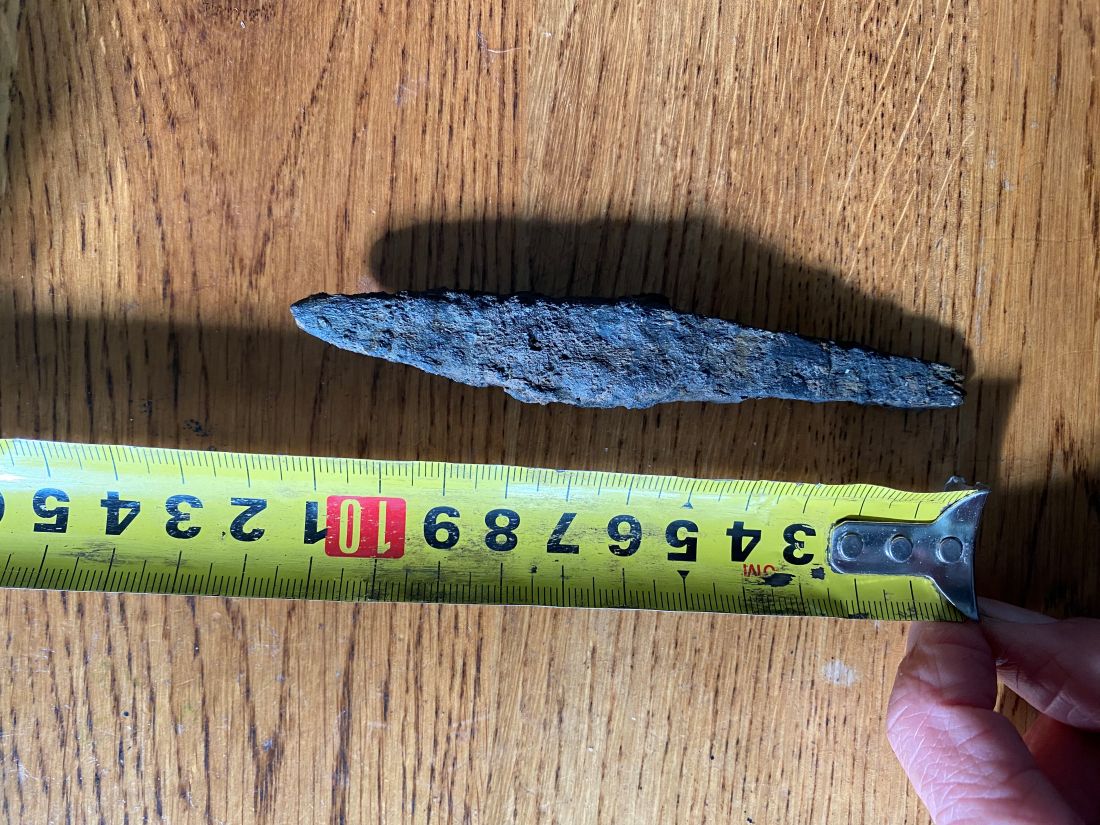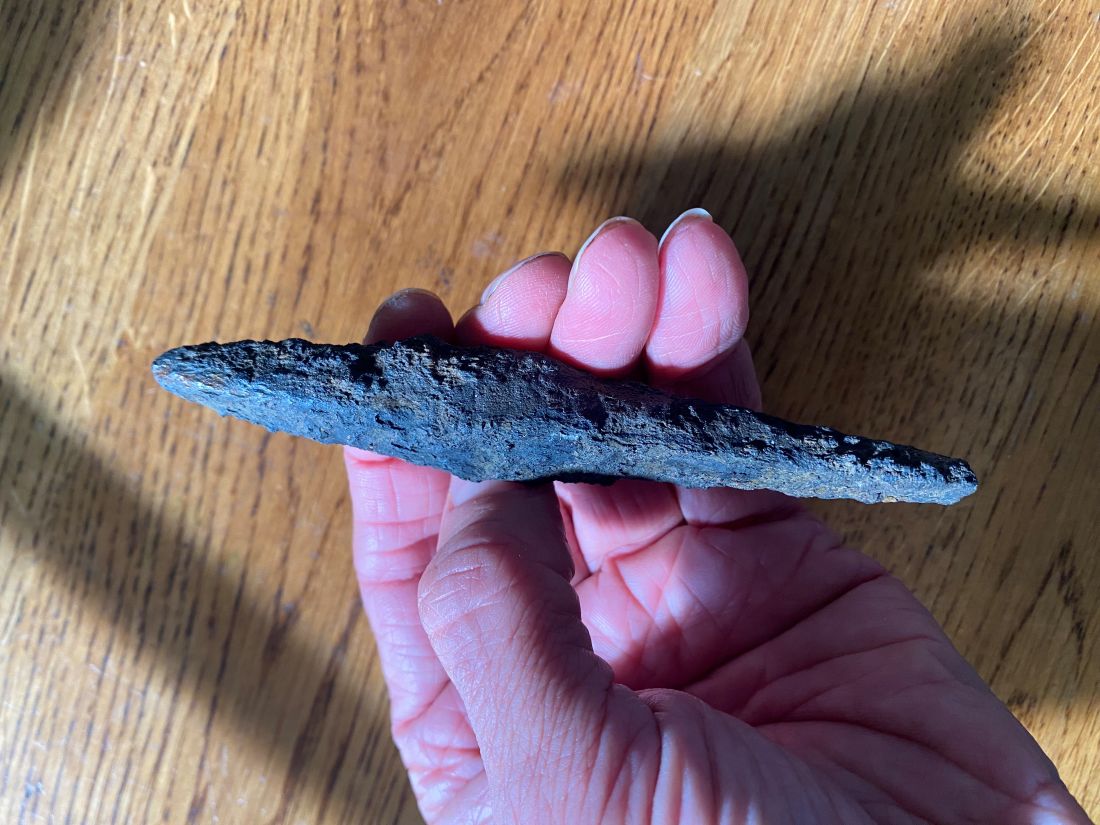 Yesterday, I found this remarkable object in the excavated soil of the old riverbed. It was nestled among a huge amount of iron ore, which largely makes up the old riverbed. I have serious doubts about its original function, but according to Google Lens, it's a Roman Bodkin arrowhead. I also see an image of such a point that exactly matches the one I found. According to the description, it's an Iron Tanged Bodkin Arrowhead. However, my example is larger and heavier and, in my opinion, too heavy to shoot with a bow. Its length is 120mm and it weighs 87 grams. The area was under Roman rule at the time, but as far as I know, nothing Roman has ever been found in the immediate vicinity. Could it possibly be a spear or ballista, or just junk? I found nothing else except some lead net weights that are difficult to date. |