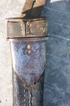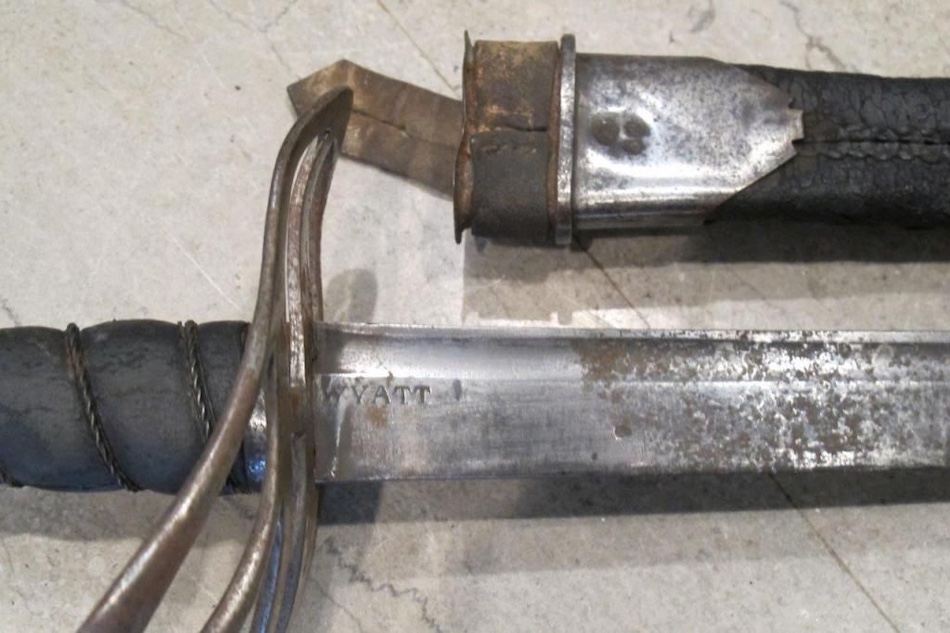 The sword is marked A/57 on the slotted guard, and on the scabbard locket. The blade still sharp is 36" long, curved and with a clip point. The name WYATT in capitals is stamped on the blade ricasso. One interesting detail is the buff leather strap on the scabbard having a slot in the strap for attachment. I have not found another example in my American sword ref books. I did see an identical sword in relic condition, without the Wyatt mark at Cribbs auction a few years ago, however was not able to add any info.