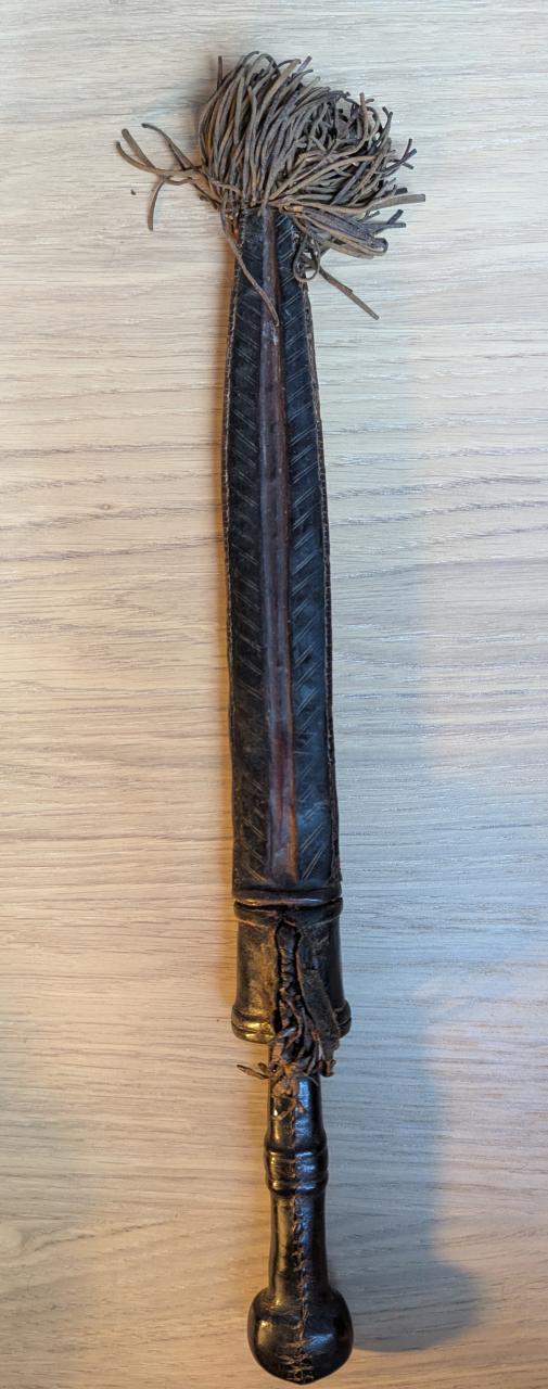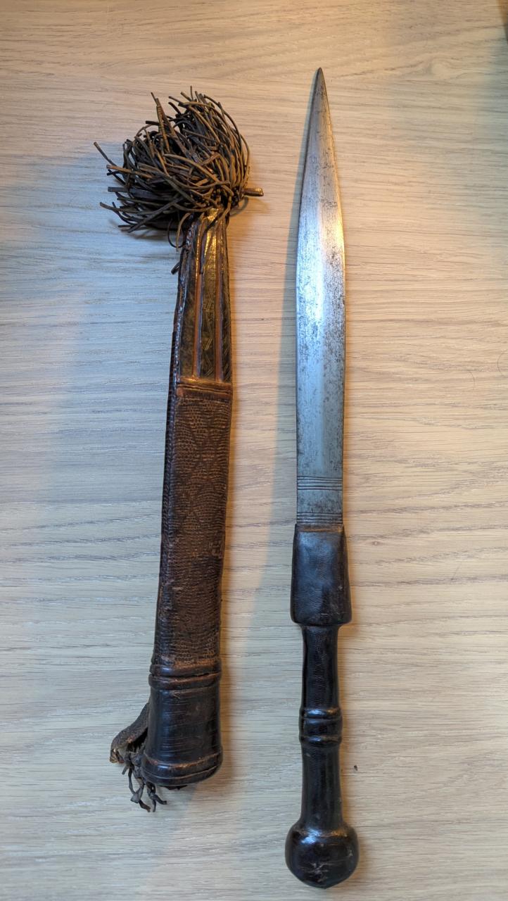 It's around 38 cm in length, which is typical, with a thick and rigid blade, apparently rather well made. The leatherwork is decent too, with some decoration even on the non-visible side. It's probably of Mandinka manufacture, but these were used by many groups all along Senegambia and Upper Guinea, as well as western Mali.