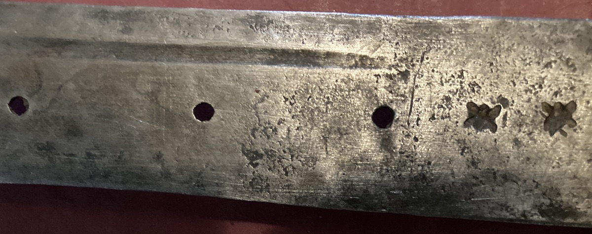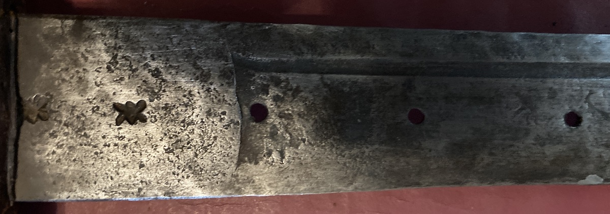 I would love it if the blade had been stamped by an Italian maker but even if stamped by an African maker as a talisman/homage/selling point, it’s good to know the origin of the stamp. If I can find a suitably sized brass rod, I will try to fill the holes. Sincerely, RobT |