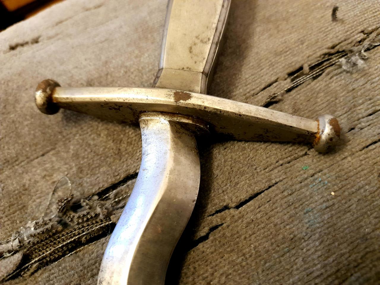I seek info on this dagger please. Hilt looks like a hunting hound. Blade is very robust and of diamond cross section and is laminated. The whole thing is steel. Any thoughts on origin and age greatly appreciated as I have had no luck figuring this out. Thanks.