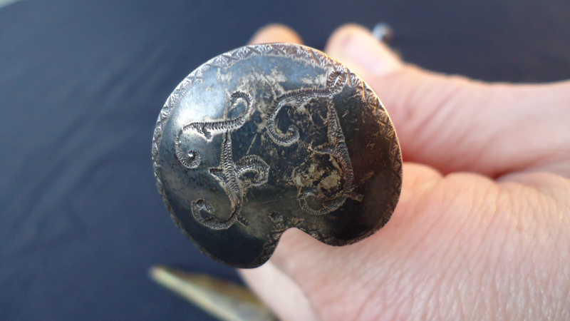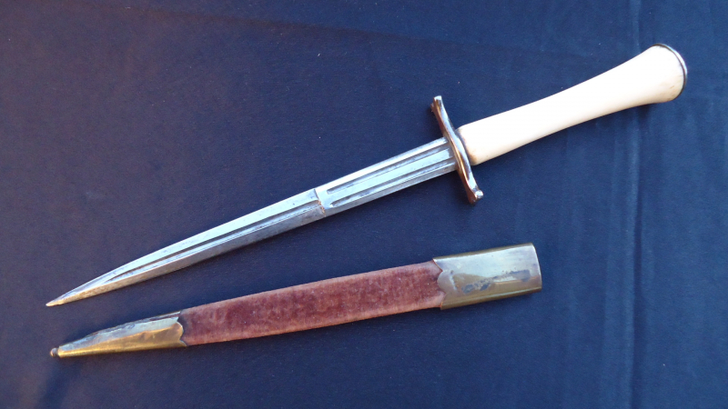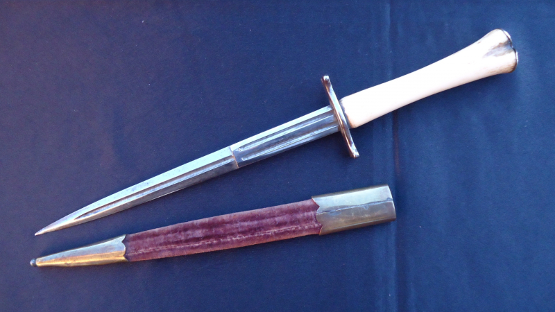 I just won this unusual bone hilted dagger. The seller suggested that it could be a Freemason dagger!? Which sort of bone could it be? The dagger is 31,4 cm long. The cap at the hilts end is silver and engraved. Any suggestions? Age? (I guess 19th c.) Thank you in advance, Detlef |