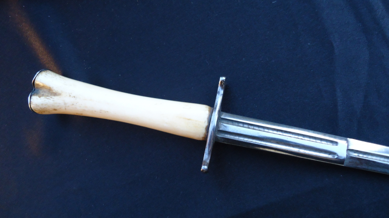 I think that the dagger could be a "coup de grace" dagger from a rich/important person from the mid. to end of the 19th century and the bone is maybe from a deer leg. I asked which bone it could be because the seller brought human bone in play but I personally think that this is most unlikely. I also don't think that it is a Freemason dagger, but this is a personal guess since I just don't know enough about this category of daggers.But it would be interesting to read what others think about this dagger!