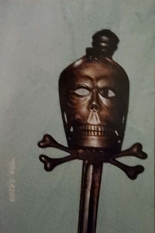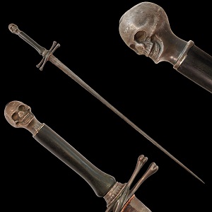I would totally agree with the Capn's perceptive observations, and this is an extremely attractive stiletto with distinctly Masonic potential. As noted, the cross guard vestigially recalls the crossed bones which appear as such on the daggers in Masonic regalia with skull pommels. These are part of the Masonic symbolism known as 'memento mori', which of course is a reminder of man's potential mortality, with skulls and crossed bones being symbolic. In the latter quarter of the 19th century, there seems to have been a propensity of using bone in hilts, and here in the US, it appears that military officers swords often became host weapons. I once had a M1840 staff officers sword which was most unusual as the standard brass wire grip was replaced with a horn grip. As it was decades ago, and not knowing what it was, I unfortunately let it go Looking back, I can now see it in this post Civil War fraternal context, much as I agree this stiletto probably is.Adding to the likely Masonic context here, are the initials engraved in the pommel cap. While Masonic weapons have typically been overlooked by arms collectors, since the publication of the book "American Fraternal Swords" by John D. Hamiliton, Joseph Marino and James Kaplan, that has quite changed. The skull and bones theme seems to have been quite well used in French Masonic context as well, as seen in this bizarre sword with full gauntlet style hilt in skull shape, mounted with Napoleonic cuirassier sword blade. Most attractive dagger with intriguing Masonic potential! |