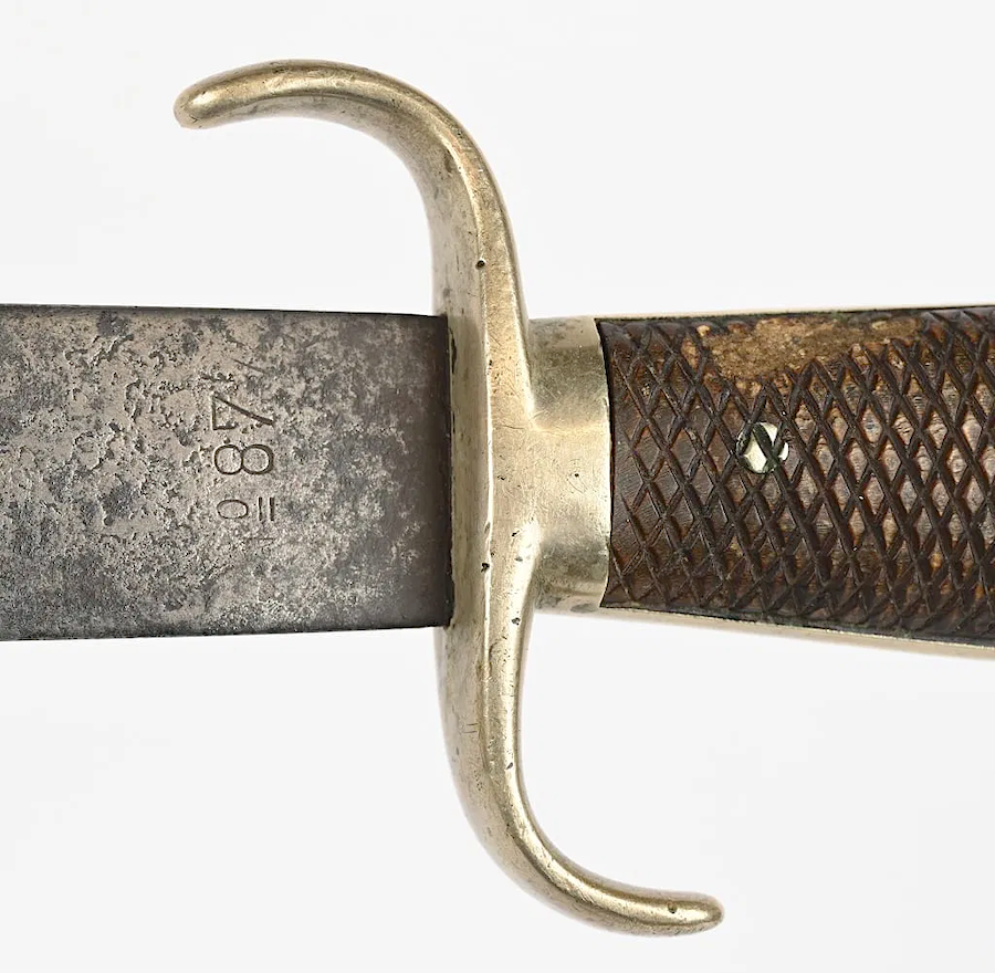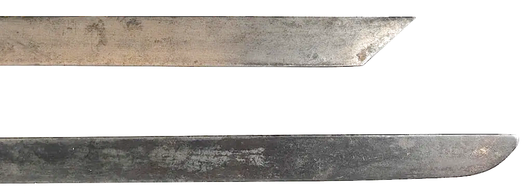 The top one is from the late 19th C and is marked "Fernando Esser Elberfeld Warranted Machete No. 87." Total length = 30.25 inches, with a 25 inch blade that shows graying. The horn handle is excellent. This sword was issued to officers. The second one is marked "Collins & Co. Machete No. 87" on the blade. Overall length = 32.5 inches; blade length = 27 inches. This machete sword was made as a copy of the Fernando Esser sword, and hence had the same model number. It was probably made in the first few years of the 20th C. Comments welcome. . |
