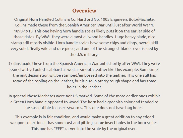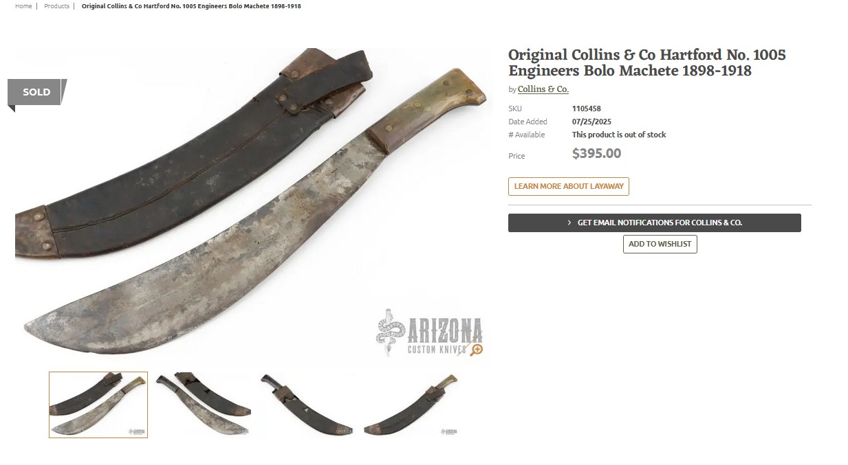 http://www.vikingsword.com/rila/costeno.html https://www.antiquers.com/threads/le...machete.79462/ Collins & Co. The Collins Company was founded by brothers Samuel Watkinson Collins and David Collins and their cousin William Wells in 1826. Purchasing a property along the Farmington River in the town of Canton, Connecticut, later renamed Collinsville. The Collins Company line of products would grow over the years to include not only axes, but also machetes, hatchets adzes, brush hooks, picks, shovels, knives, swords, bayonets and plows, making them the world’s leading manufacturer of edge tools. The Collins line of machetes was so popular in Central and South America that they were referred to as a “Collins” and 90% of the machetes sold in these countries were made by The Collins Company. The company operated several manufacturing facilities in Guatemala, Mexico, Columbia and Brazil. Collins bayonets were used during the Civil War, axes and picks and other tools made their way to the California Gold Rush, Admiral Peary brought numerous Collins products on his trek to the North Pole, and Collins tools were used almost exclusively for the construction of the Trans-Siberian Railroad. The Collins Company manufactured shovels, picks, axes and machetes for World War I and over 1 million machetes were purchased by the U.S. Military for World War II. 140 years after the inception of the Collins Company, the factory closed its doors in 1966. |