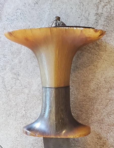 With respect to the hilt materials, while I have not been able to confirm this, I've read at least one source that claimed the light colored, yellowish hilts were made of giraffe hoof, whereas the darker horn may be either rhino or bovine. But then again, buffalo/cow horn comes in different shades so perhaps the giraffe hoof is just a bit of fanciful advertising. Both pieces of your grip look like horn to me, rather than wood.