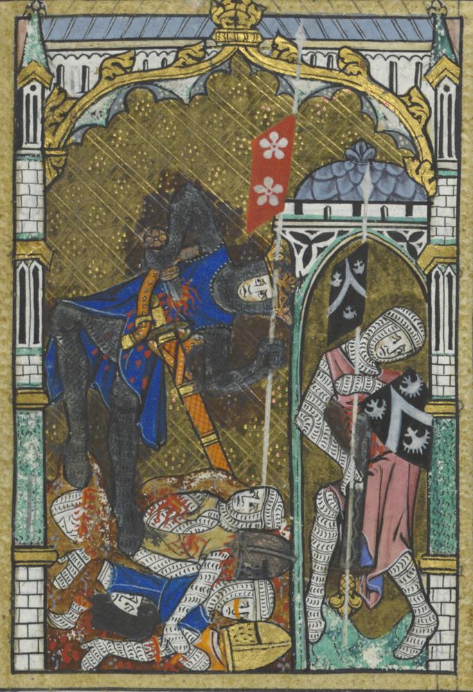 I have indeed read the Gibraltar paper. It is a great read. As for Jean's sword: I would loathe to disagree with you, especially as I obviously respect your much greater knowledge, and especially as I am a fledgling researcher myself. However, I would like to raise some points of consideration, if I may. I believe Helmut dismisses the possibility of the sword being European or Islamic far too quickly. Firstly, more to the point of jinetes and pre-jinete Islamic swords, and as Nicolle notes*- small guards with trilobate pommels are found in quite a number of Iberian depictions, Islamic or otherwise. Besides just the Andalusian example shown, trilobate pommels themselves apparently appear to a frequency enough in Spain for Oakeshott to note them in his typology as 'of a Spanish type' (type L). You might find more examples of Spanish triloabtes in, for example, BL Additional 11695 Beatus of Liebana (available on ManuscriptMiniatures). (Though here I have to make a note that the pommel of the trefoil shape shows over and over again in other parts of Europe too, mainly France. I'll attach a particularly good example of a fleur-de-lis pommel from folio 024r of the KBR Ms.9961-62 Peterborough Psalter.) The Met paper also claims that the wrapping of the hilt is atypical for European swords. This much is true. However, it does not appear that it is unprecedented. Besides the fact that the double-looping style does not appear on any of the (small number of) Chinese swords I have seen, it is actually found in Europe. I know of at least three examples, the most clear and relevant one being the effigy of a knight in San Lorenzo Maggiore, near 1300. You'll probably find him as 'Naples Knight A' on EffigiesandBrasses.com. ("As such they (small, curved guards) probably reflected Islamic Andalusian rather than Christian northern Spanish military styles, particularly as they are mostly on swords whose scabbards are carried on baldrics rather than sword-belts. In these manuscripts, however, the down-turned quillons are often associated with the clover-leaf or trilobate pommel rather than the spherical pommel of the Gibraltar sword.") |