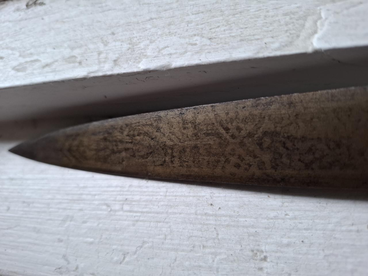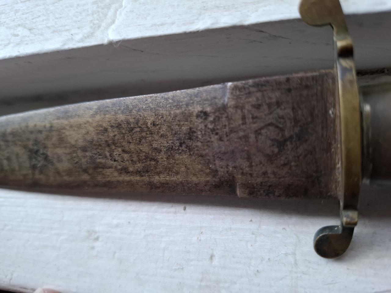 This dagger has been made out of a cut down, probably, British officers infantry sword. The 'Star of David' is in actual fact two triangles meant to represent strength re the swordsmithing process. Difficult to give you a time scale but at a guess late 19thC to early 20thC. The pattern down the blade is a further clue to the lineage of the dagger as most British Officers swords had some sort of decoration on the upper part of the blade. Regards, Norman. |