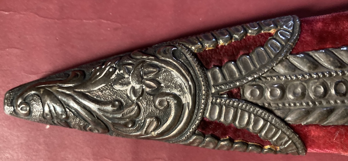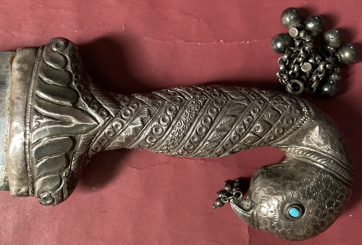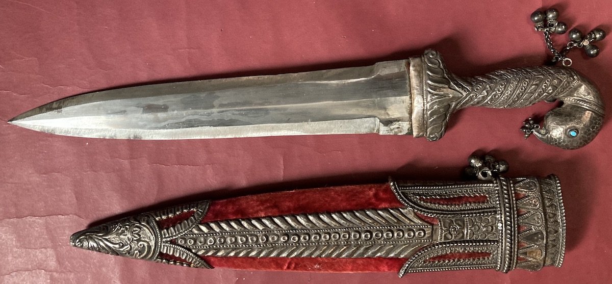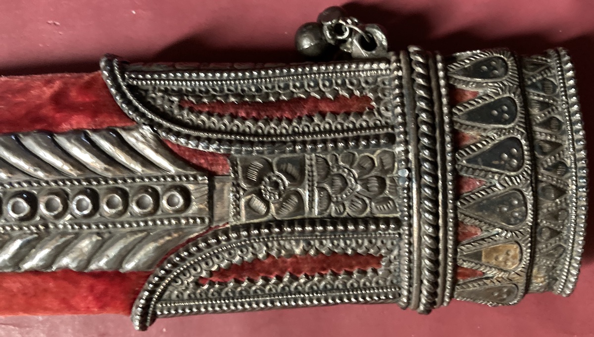 If the hilt and the sheath fittings aren’t silver, somebody did a very good job of making them look like it. Somehow, the work on the hilt and sheath reminds me of what is seen on kothimari khukris.