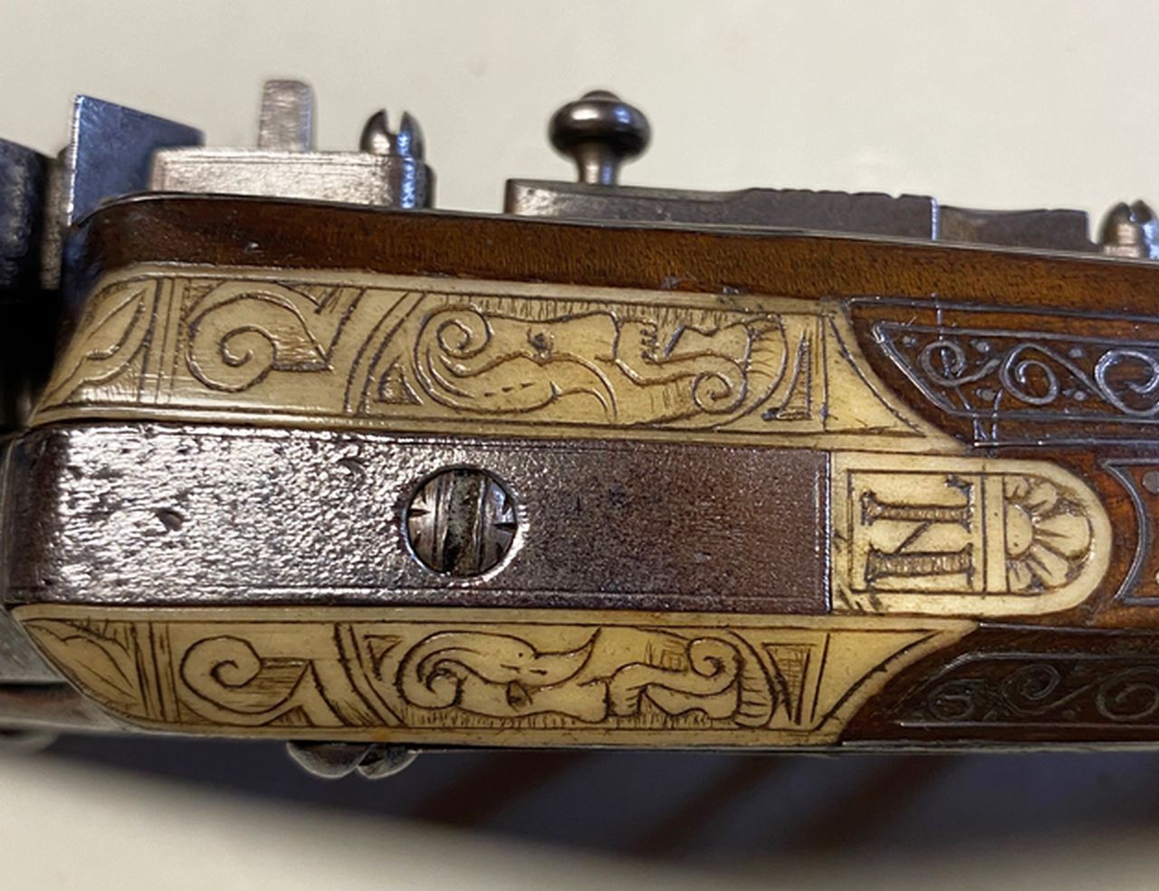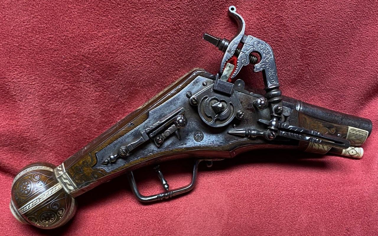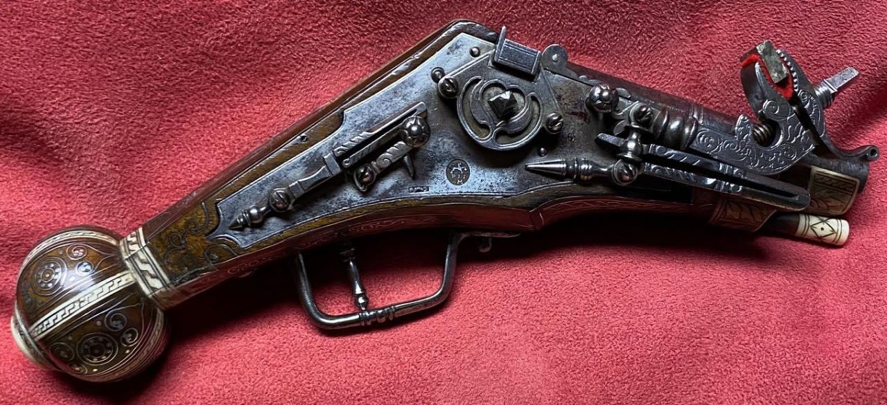 I have in my collection a rather small wheellock pistol with a total length of 220 mm and a barrel length of 124 mm, at the barrel is a "1", so that I think that the pistole may be one of a pair. The lock shows a mark "PLI/M under a lion which is absolutely unknown to me. Is here anybody whoknows this mark?