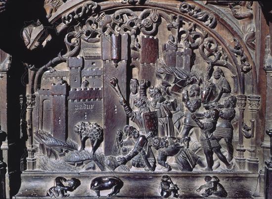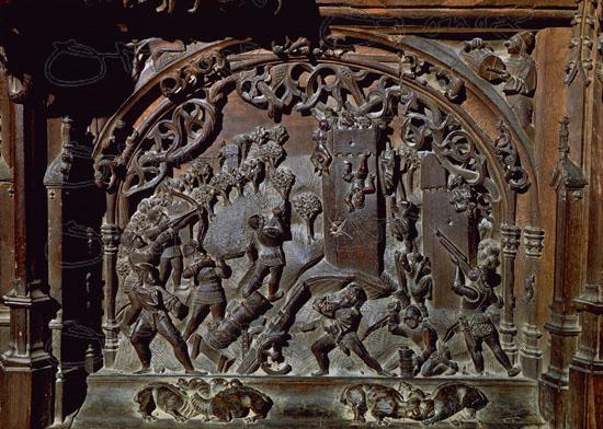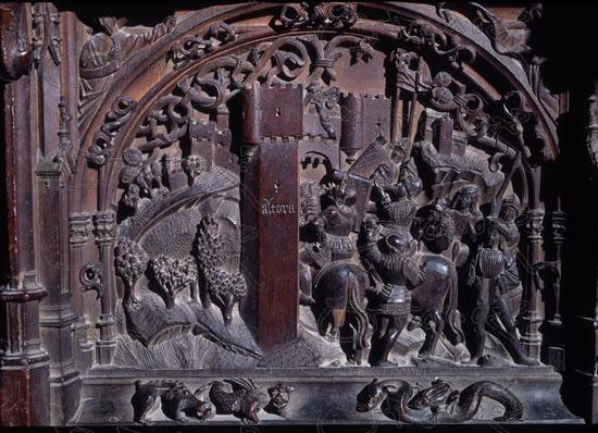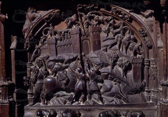 Lower tier of choir stalls in the Coro, which were carved by Rodrigo Alemán in 1495 and feature 54 historical scenes from the conquest of Granada in remarkable detail. Each seat shows the defeat of a village.