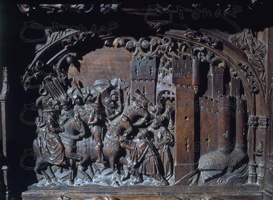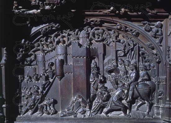 The late gothic carvings in the low choir of the Toledo cathedral were made by the artist Rodrigo Alemán between 1495-1498. The main scene does in fact represent the conquest of Granada (El Alhambra) by the Catholic Kings.