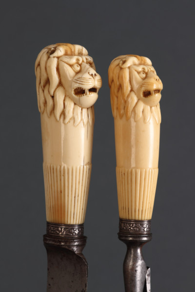 I consider decorative Kastane style here and bring another item of beautiful hand carved Ivory as a sample of excellent artesan production.. Here is an Ivory Sri Lankan box... hand carved in identical fashion to the swirls of the Makara tail often incorporated into Kastana hilts... The one with the Iconic Zoomorphic style is described as ~ Such cabinets were produced in Ceylon (present day Sri Lanka) off the western coast of India on commission from Portuguese traders for the European market by the mid 16th century. The shape and function are European, but the subject and style of the elaborate carving, including perforation of the ivory plaques that make it up, are characteristic of Ceylon. The plaques of ivory are carved in low relief, backed by sheets of tortoise shell and with silver fittings (corner pieces, rivets, key plates, original key and handles). On the front, the upper drawer is decorated with confronted lions spewing scrolls enclosed in borders of quatrefoils and beading; the lower two drawers have key plates and scrolling, with identical borders. On the sides are square central panels with winged leonine fantastic creatures with reptilian scaled tails (serapendiyas) enclosed in borders surrouned by scrolling and framed with borders. On the top are two confronted leonine creatures, similar to those on the sides, enclosed in beaded ovals and scrollwork, further enclosed in a border with outer scrolling and border. On the back is an oblong field with fragment of leonine creature enclosed in beaded frame with elaborate scrolling and border. The underside is composed of plain ivory. There is also a small section of border in the upper drawer. So as not to be out done by the Cromwellian Museum I also sourced a carving set with Lionesque Sri Lankan Icons for hilts...Maybe the hilts shown earlier were previously swords on 'Armour Cromwellian' after all ! :p Regards, Ibrahiim al Balooshi. |