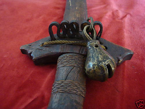 Hard to tell. Nice that it has a scabbard and mansala cloth. It once had a metal "eye" on each side of the hilt.
