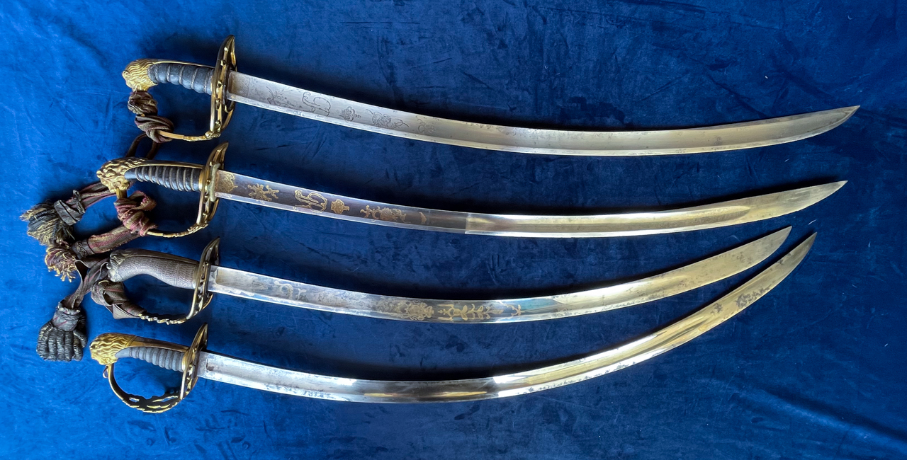Jokes aside I have recently received an early 19th-century British Grenadier officer's sabre with a very large and highly curved blade. The style of the hilt follows the 1803 Pattern 'flank officers' sabre but it isn't true to the pattern, lacking the Crowned GR cypher normally found. Attachment 225018 Attachment 225020 Attachment 225021 Attachment 225022 This could mean that the sabre predates the 1803 Pattern, as this Pattern was already a variation on what 'flank' and some line officers had started to carry with the loosening of regulations in 1800 (allowing Grenadier and Light Company officers to carry sabres). As we've talked about previously, military fashion played an important role in Georgian (and other European) society, especially Hussar fashion. And around the last two decades of the 18th Century, it became fashionable (and more practical) for infantry officers to carry sabres and hangers in place of smallswords, backswords or broadswords. After encountering the Mamelukes in Egypt, with their wickedly effective shamshirs, highly curved blades became all the rage in Great Britain. Unfortunately, the resulting blades often misinterpreted correct shamshir blade geometry and resulted in a weapon that was more show than function, especially when combined with the fighting style most officers learned. This sword is such an example; this image shows my 1803 Pattern Swords with the Grenadier Sabre. Their blade length and curve are as follows: Attachment 225019 1. 1803 by Prosser: length 80.7cm Curve 5.1cm 2. 1803 by Bennett: length 81.2cm Curve 5.5cm 3. 1803 By Griffin & Adams: length 76cm Curve 7.3cm 4. Grenadiers Sabre: length 82.2cm curve 11.4cm (both the Prosser and the Bennert use blades imported by J J Runkel). Regrettably, the blade is unmarked and this particular style of guard doesn't appear in any of my sources. Has anyone here seen this guard before and his it been attributed to any regiment or militia unit? Thank you. |